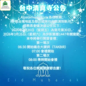 台中清真寺宣佈 2026年3月21日為伊斯蘭開齋節
