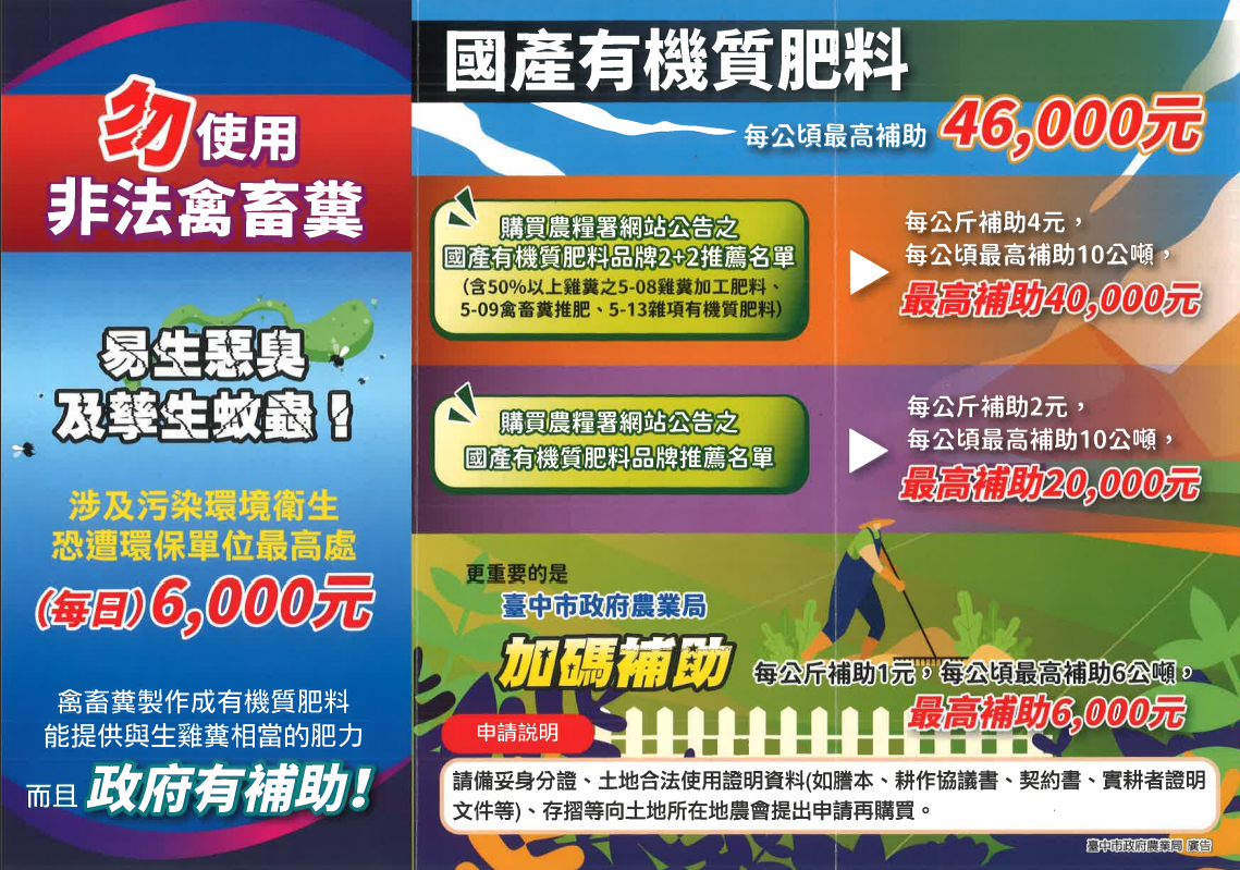農業局說明,購買或施用肥料務必遵循肥料管理法相關規定,並善用農業部農糧署肥料管理整合資訊系統「肥料廠牌查詢」功能選用具有效登記證之合格肥料產品。請依產品包裝所載施用時機、方法、用量及注意事項施肥,並即時翻埋覆土,降低肥料異味。