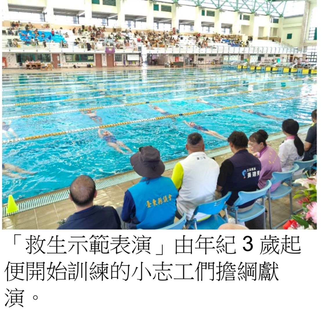 臺東救生新於 114 年 10 月 12 日(週日)上午 8 時起,在國立臺東大學附 屬體育高級中學游泳池舉辦,本場賽事由「臺灣慧行 志工救生游泳協會」主辦,共有 163 名選手報名參 加,其中更有 63 位是十歲以下的選手,他們不畏深 水池的挑戰,期許可以超越自我、締造佳績。此次選 手們除了來自花東地區,更遍及屏東、高雄、臺南、 臺中、新竹、桃園、新北、臺北等地,大家響應著本 賽事多年來建立的好口碑,來到好山好水的台東後山 以“泳”會友。