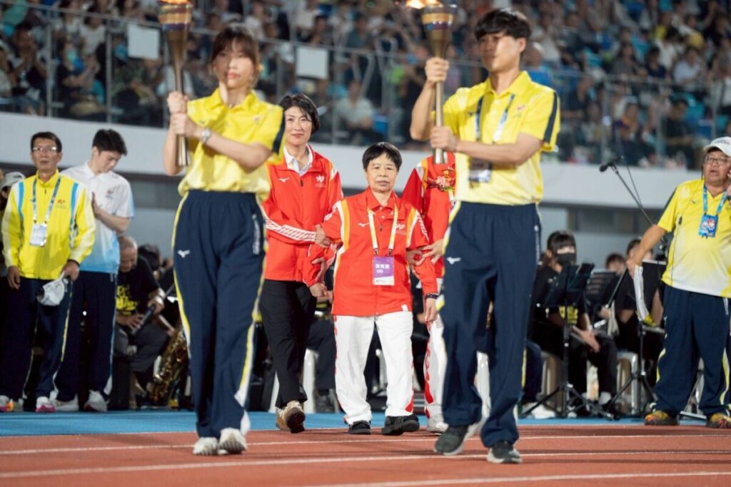 饒慶鈴、雲林縣張麗善縣長與陳樹菊阿嬤也共同傳遞了一小段全運會聖火,向大會致敬、也把更多臺東的美好與良善傳達給更多人。