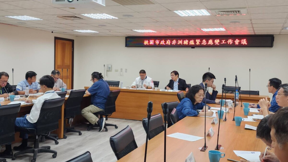 台中出現非洲豬瘟疑似病例,農業部今(22)日召開記者會說明;對此,桃園市政府嚴陣以待,立即成立跨局處應變小組,由秘書長溫代欣召開跨局處協調會議,邀集動保處、農業局、環保局、衛生局、教育局、民政局、警察局、消防局、經發局、水務局、新聞處等單位,下達各項防疫作為,並擬定10道防線落實分工,嚴陣以待非洲豬瘟。市府同步進行產業影響評估,動用第二預備金支援防疫所需與農民補助。