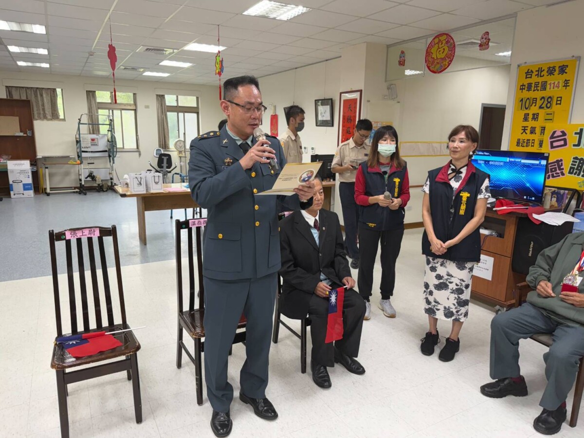 為表彰長年為國奉獻的忠勇榮民,新北市後備指揮部今(28)日前往臺北榮譽國民之家舉辦「抗戰八十週年紀念章」致贈活動。由指揮官溫上校率領同仁代表國防部,親自頒贈紀念章與感謝卡,向當年投身抗戰、保衛國家的前輩表達最崇高的敬意與感恩之意。