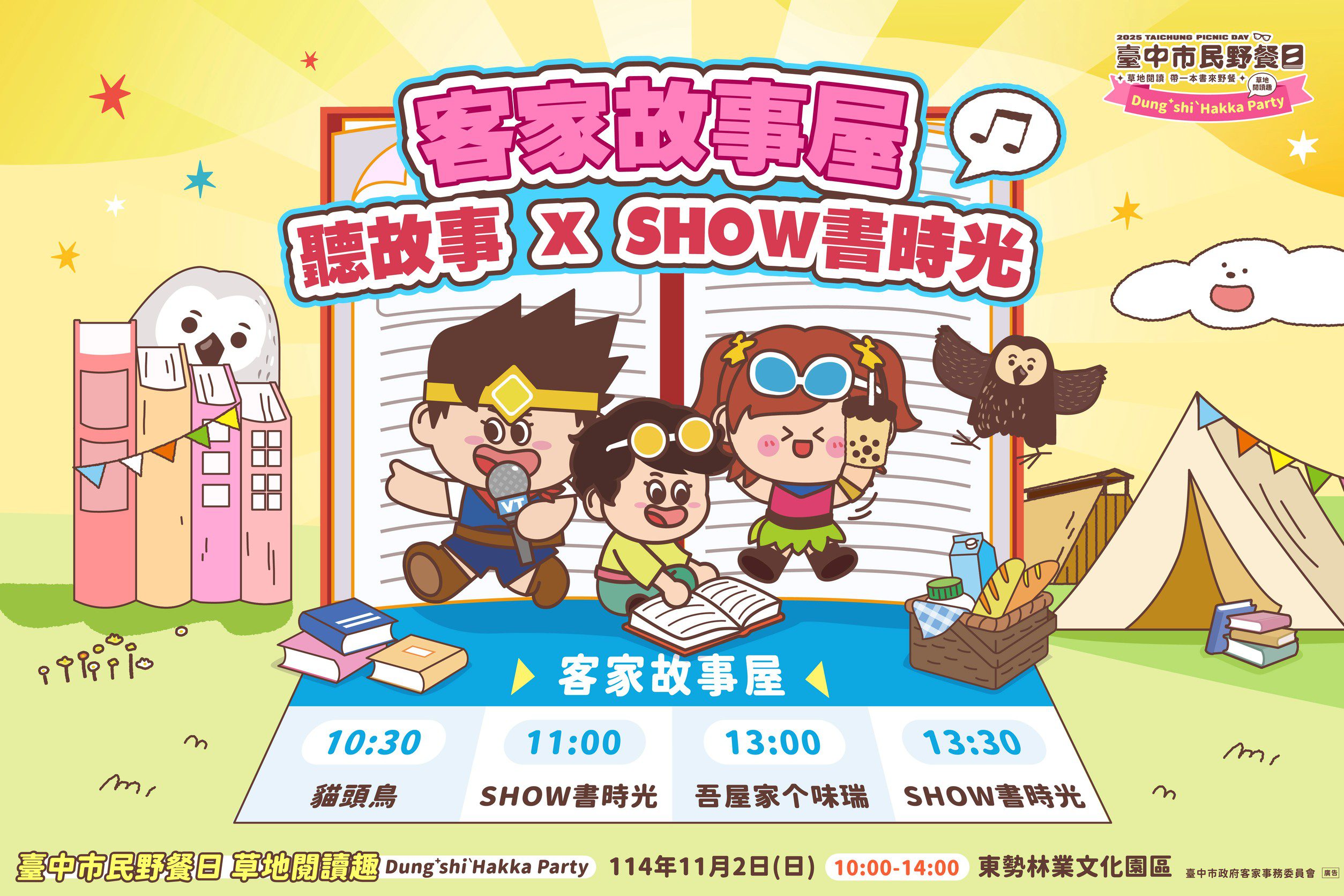 一年一度的「台中市民野餐日」即將登場!2025年活動由台中市政府客家事務委員會與東勢區公所共同舉辦,將於11月2日上午10點至下午2點在東勢林業文化園區盛大舉行。今年以【DungShi Hakka Party】為主題,結合「草地閱讀趣」活動概念,邀請市民攜帶喜愛的書籍、輕食與墨鏡,在陽光灑落的草地上享受悠閒午後時光,感受閱讀與客家文化交織的魅力。