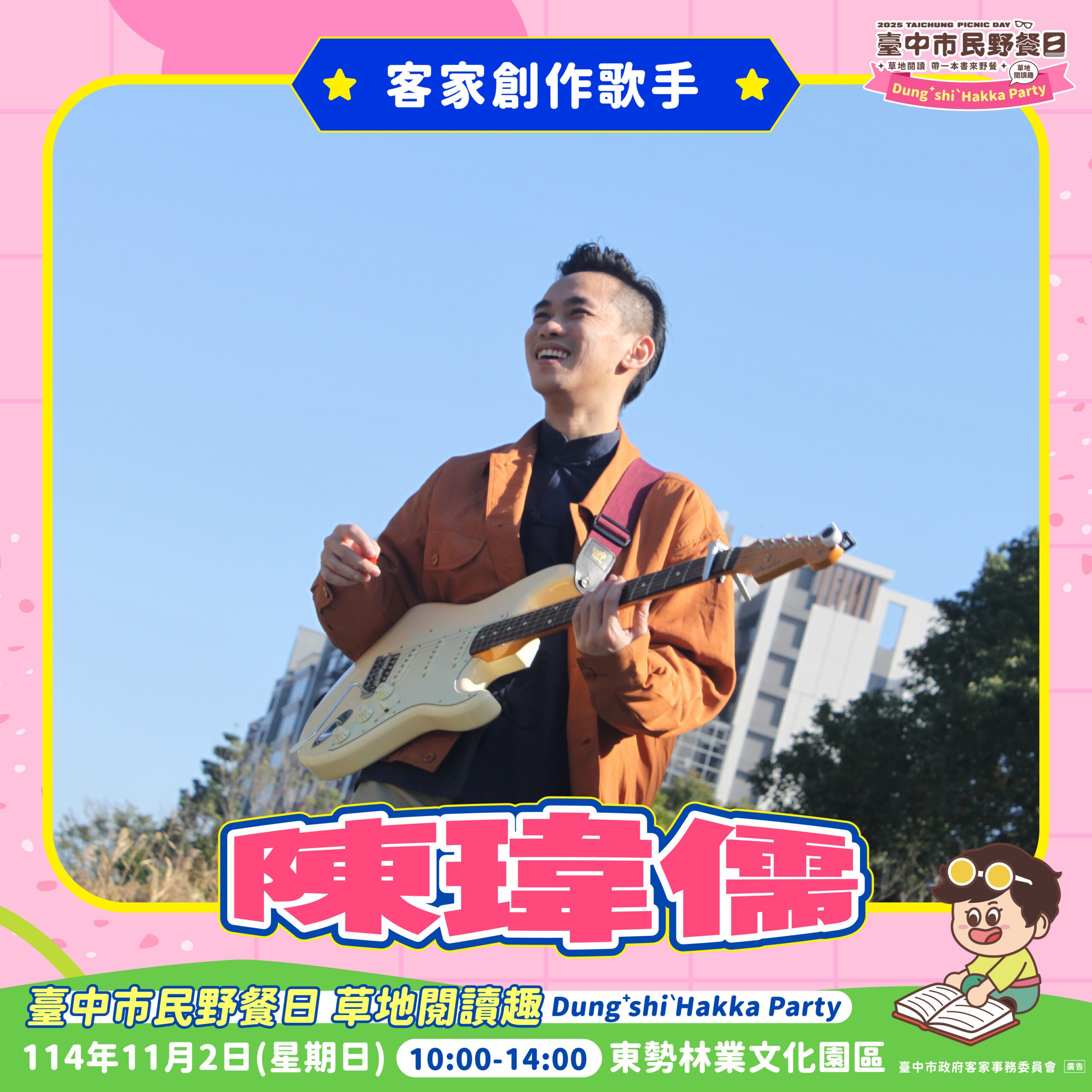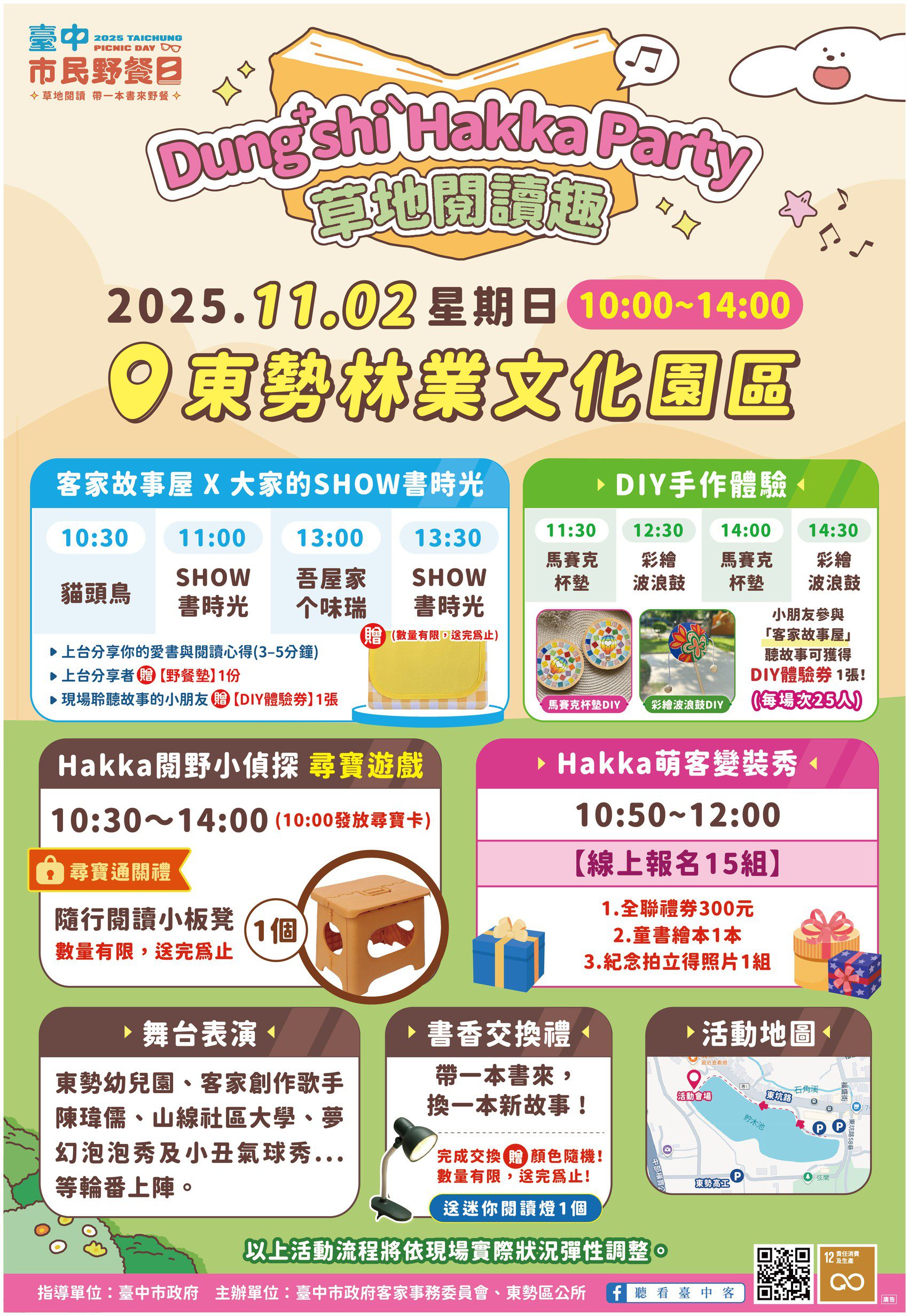 今年的「台中市民野餐日」融合閱讀、客家文化與親子互動,客委會邀請民眾在自然中放慢腳步,享受一場最Chill的森林野餐體驗。更多活動詳情,請上台中市政府客家事務委員會粉絲專頁「聽看台中客」(https://www.facebook.com/hakka.taichung)查詢。