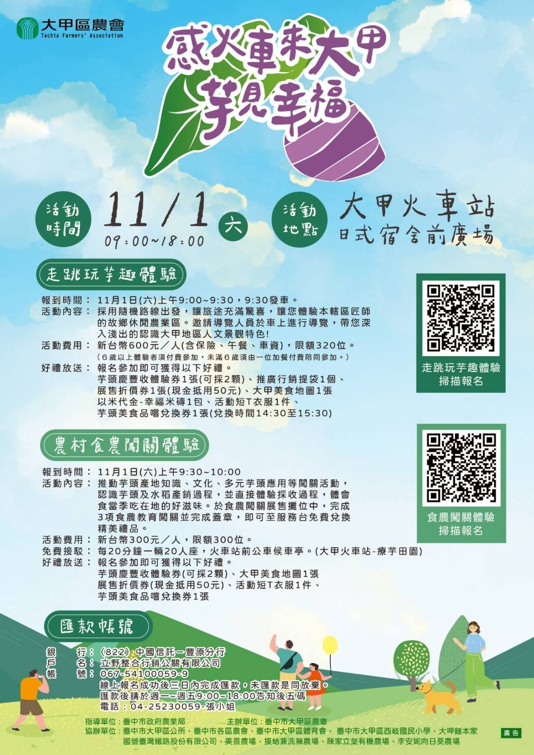 此次活動農會結合在地當季食材,從產地到餐桌,期望藉由體驗活動落實食農教育理念,讓參與民眾深入了解農業文化與食材來源,並帶動地方觀光與休閒農業發展,誠摯邀請全國民眾搭乘火車來到大甲,一同感受大甲芋頭的幸福滋味,體驗豐富多彩的農村魅力。