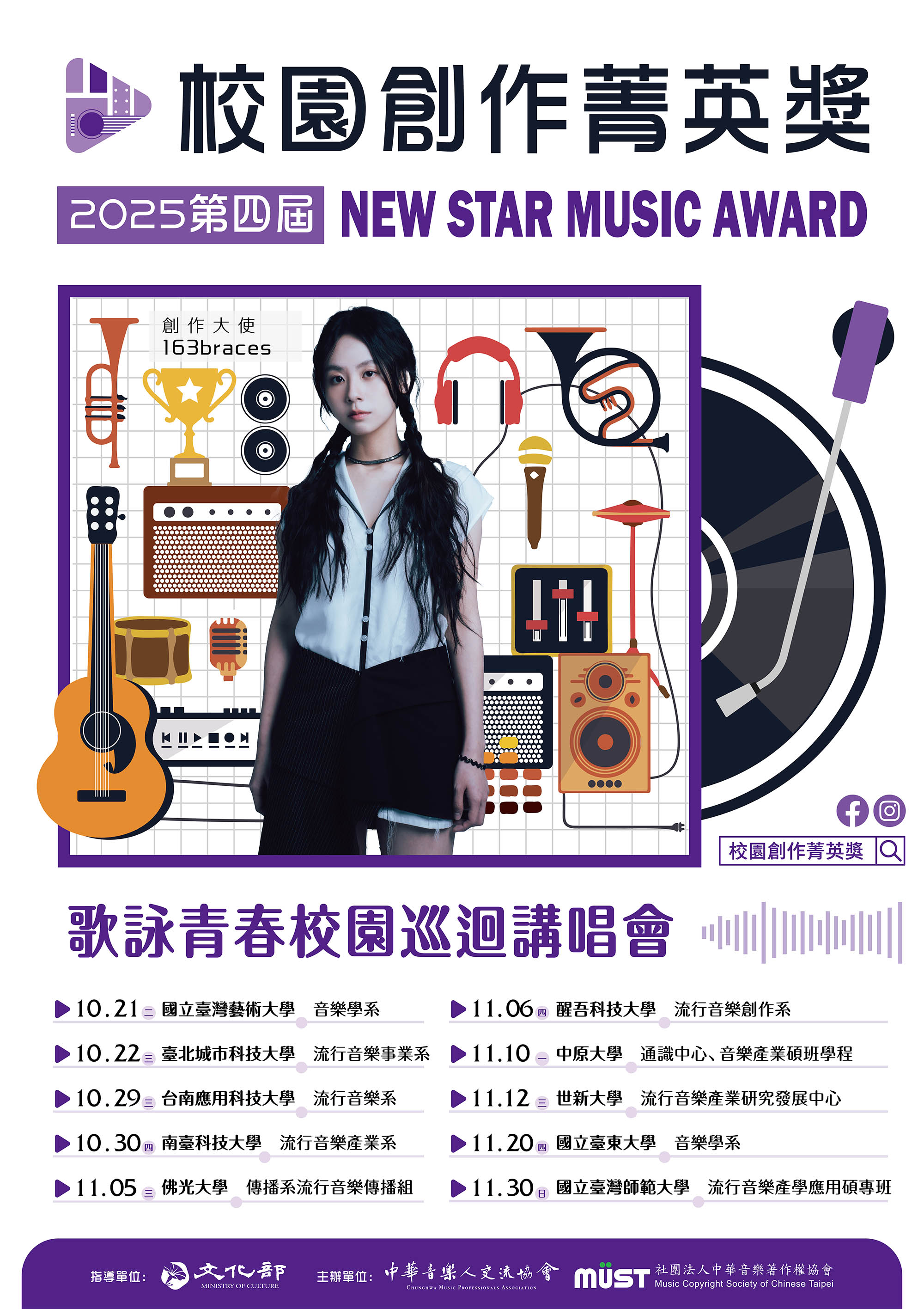 《2025 第四屆 校園創作菁英獎》歌詠青春校園巡迴講唱會共舉行十個場次,其中163braces出席了台藝大和台北城市科大兩場,後則因演出不克參加,其餘八場資訊如下,10/29台南應用科技大學流行音樂系、10/30南臺科技大學流行音樂產業系、11/05 佛光大學傳播系流行音樂傳播組、11/06靜宜科技大學流行音樂創作系、11/10中原大學通識中心音樂產業碩士班、11/12 世新大學流行音樂產業研發中心、11/20國立臺東大學音樂學系、11/30國立臺灣師範大學流行音樂產學應用碩專班。文化部所支持的「校園創作菁英獎」今年邁入第4屆,持續每年廣邀大學在學的校園創作菁英踴躍報名參加,相關資訊可搜尋「校園創作菁英獎」ig,以及主辦單位的FB粉專。