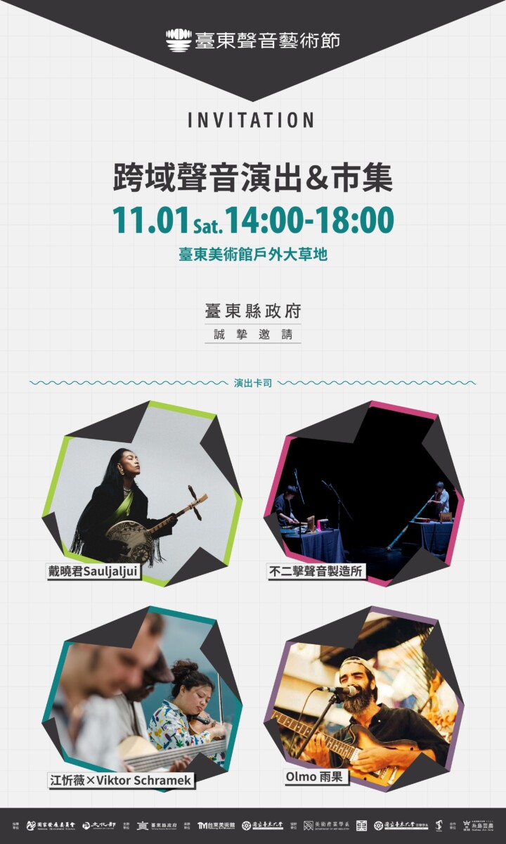 第六屆臺東聲音藝術節將於11月1日下午兩點至六點在臺東美術館戶外草地登場,舉辦「跨域聲音演出與創意市集」,以開放場域與多重感官體驗為特色,由今年金曲獎最佳原住民語專輯得主戴曉君 Sauljaljui 攜手臺東大學音樂系管弦樂團開場演出,帶領觀眾進入一場聲音、表演與環境交織的盛會。
