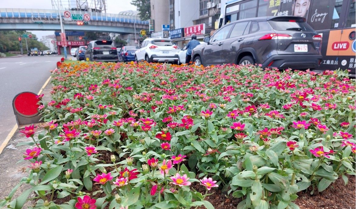 民族東路、靠近濱江市場的道路分隔島上,近日綻放著繽紛亮麗的百日草。公園處表示,為提升都市綠化品質,打破道路冷硬的印象,並為來往行人與駕駛者帶來片刻放鬆的視覺饗宴,部分道路分隔島特別依照花期,輪替栽植不同種類的草花,讓花朵在四季更迭中不斷綻放。