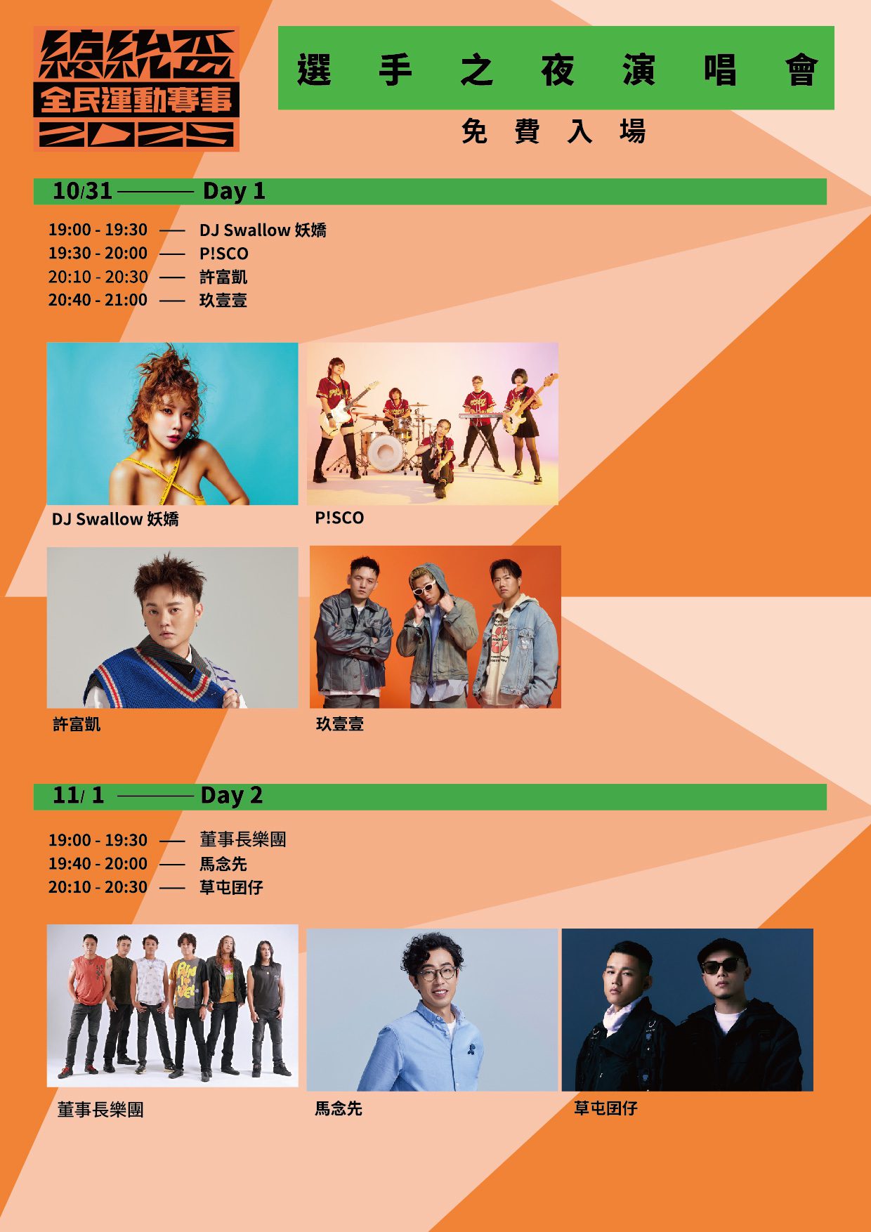 主辦單位更結合音樂能量點燃全場運動魂,邀請玖壹壹、許富凱、董事長樂團、P!SCO、DJ妖嬌、草屯囝仔、馬念先與九天民俗技藝團輪番登台,從搖滾、嘻哈到傳統鼓陣,音浪與球賽熱度交織,預計將掀起一波又一波高潮。