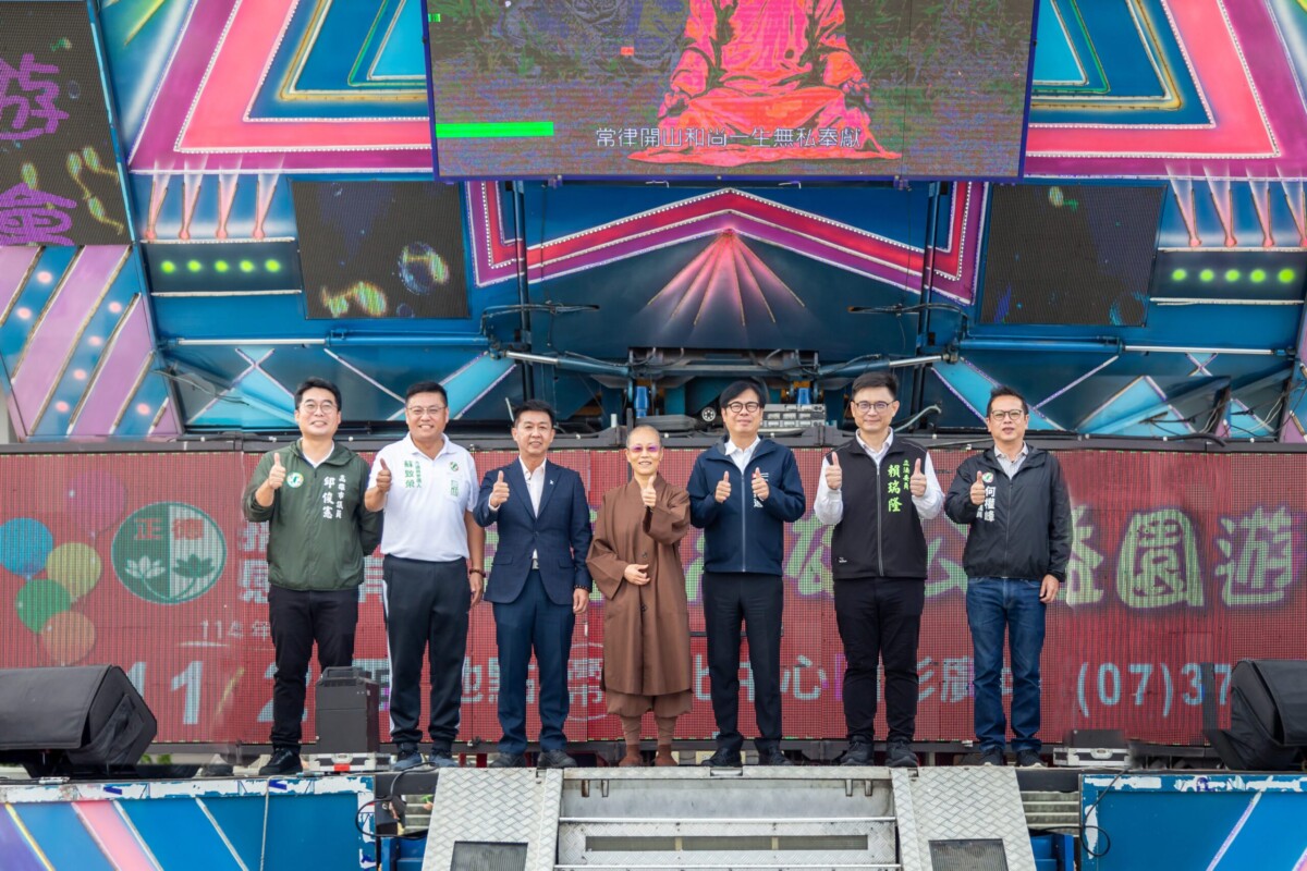 圖:正德幸福高雄公益園遊會與會貴賓合照,正德社會慈善福利基金會演音法師(右四)、高雄市陳其邁市長(右三)、立委賴瑞隆委員(右二)、立委許智傑委員(左三)、高雄市何權峰議員(右一)、高雄市邱俊憲議員(左一)。圖/正德慈善基金會提供