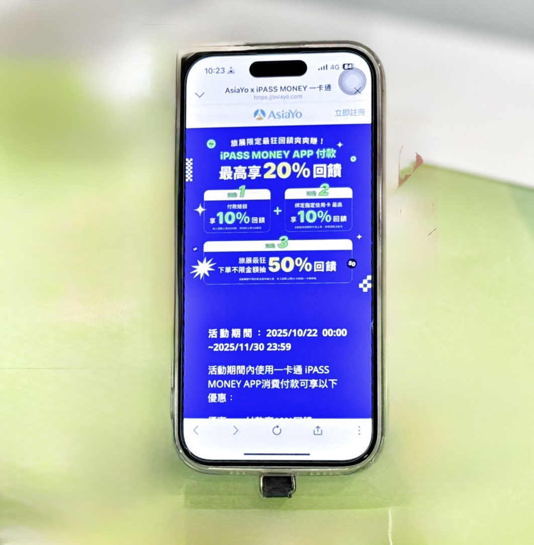 IPASS MONEY普發現金放大術,活動期間於旅宿平台【AsiaYo】使用iPASS MONEY APP付款享10%回饋,讓出遊住宿超輕鬆。旅遊途中最擔心3C產品故障或沒電,即日起至【燦坤門市】使用iPASS MONEY APP付款可享8%回饋,採購旅遊電器、行動電源等用品時,還能同步累積回饋,一舉兩得;iPASS MONEY APP消費超方便,於全台指定店家掃【一卡通TWQR立牌】付款,消費皆可享5%回饋,每月最高上限100點,讓日常用餐、購物輕鬆累積點數,消費回饋無所不在。