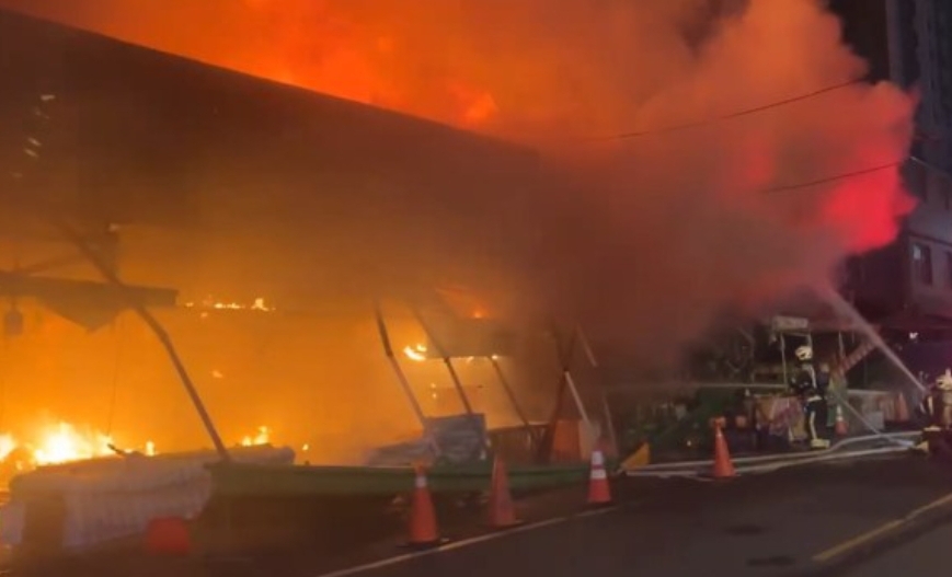 現場消防人員持續灑水撲救中,因市場內疑似有瓦斯鋼瓶與電線設備,傳出多次爆炸聲響,火勢一度猛烈,現場警戒線已封鎖,消防單位正全力控制火勢與確保安全。