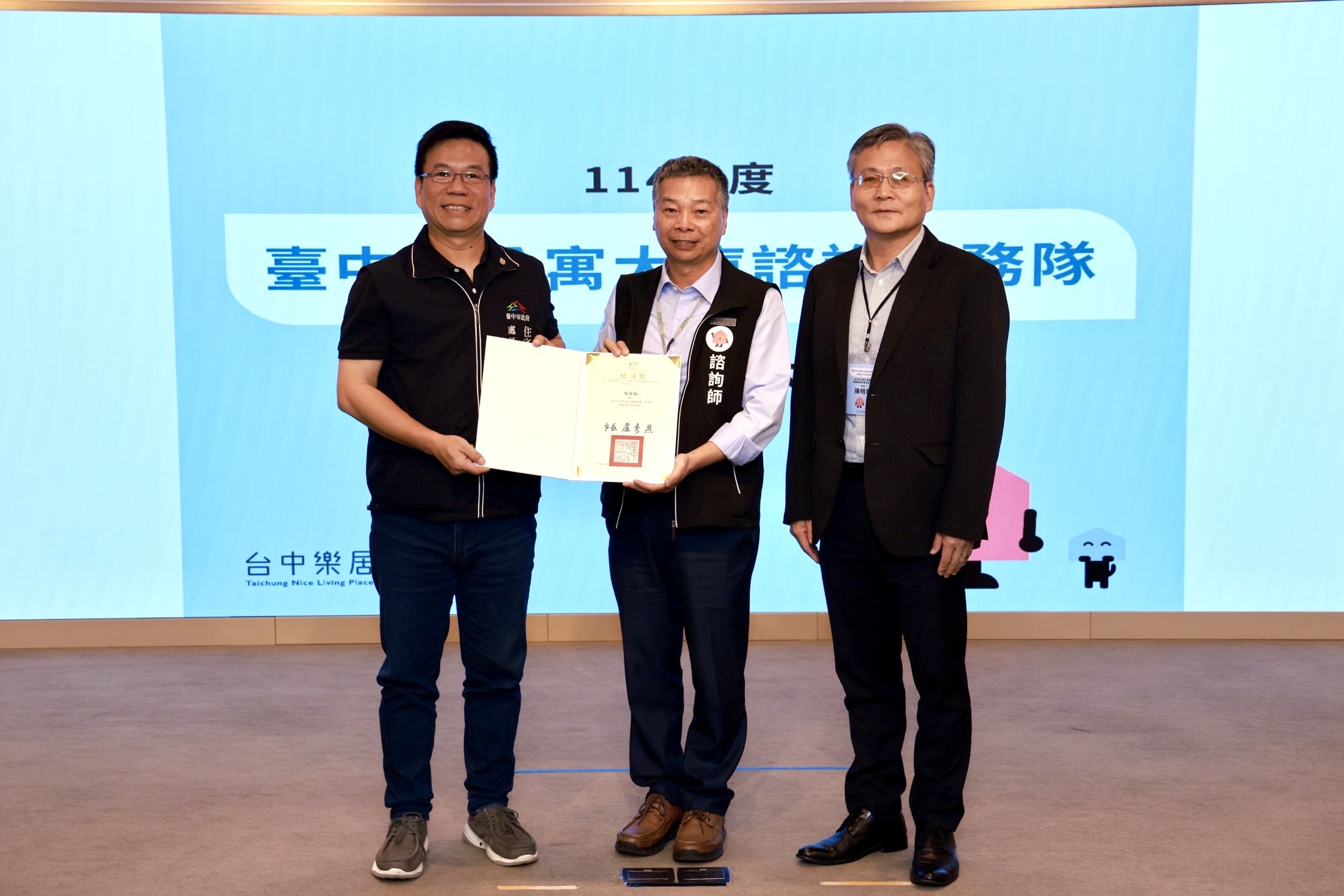 台中市政府都市發展局今(7)日舉辦「公寓大廈諮詢服務隊」表揚典禮,由住宅發展工程處長陳煒壬頒發感謝狀,給熱心服務市民的諮詢師及四大公寓大廈從業團體,感謝公私齊心協力、提升市民公寓大廈生活知能;現場併同辦理志工教育訓練,邀請專家分享公寓大廈法令與實務執行,充滿服務熱忱的諮詢師們從各方齊聚,現場氣氛熱絡。