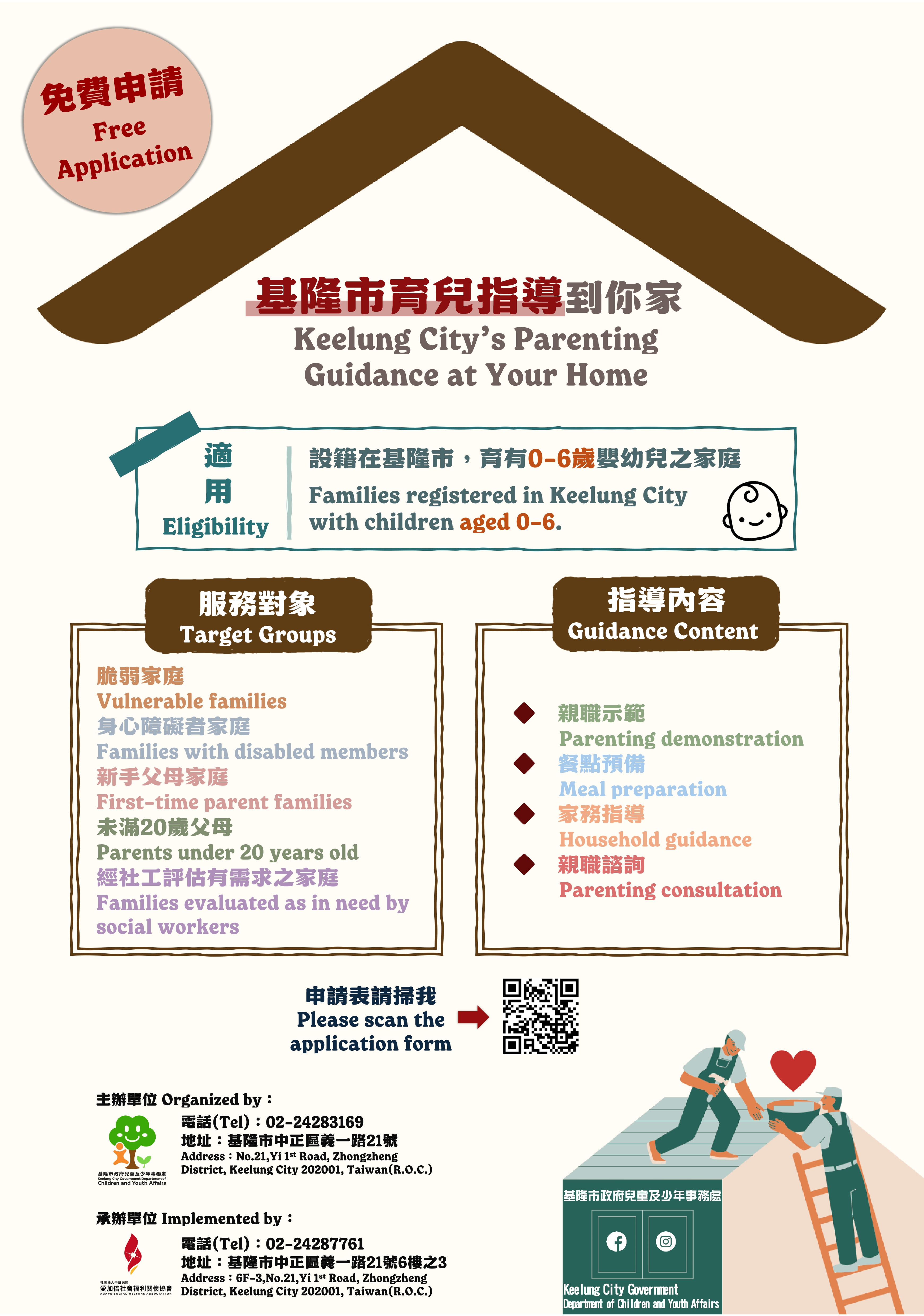 兒少處處長吳雨潔表示,為強化在地家庭支持系統及遂行社會安全網2.0計畫之前端預防性支持措施,114年度由市府攜手社團法人中華民國愛加倍社會福利關懷協會,以公私協力的方式,積極推動「育兒指導服務」。凡居住於基隆市、育有六歲以下兒童且有照顧需求的家庭,皆可以電話或線上表單申請。經協會媒合後,由經過完整訓練的指導員免費到宅提供親職示範、餐點準備、家務指導與親職諮詢等四大項服務,協助家長建立正向教養觀念與照顧技巧。