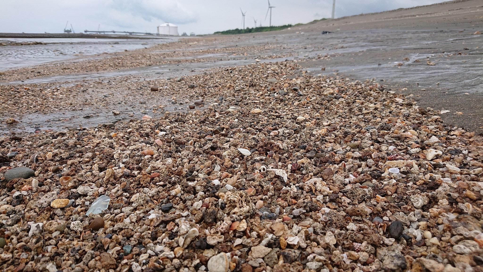 只要三接有新的海上工程進行,大潭藻礁岸邊就會出現被浪潮打到岸邊的藻礁碎屍,環團痛陳,絕不是「三接沒有蓋在藻礁上」。圖/珍愛桃園藻礁臉書