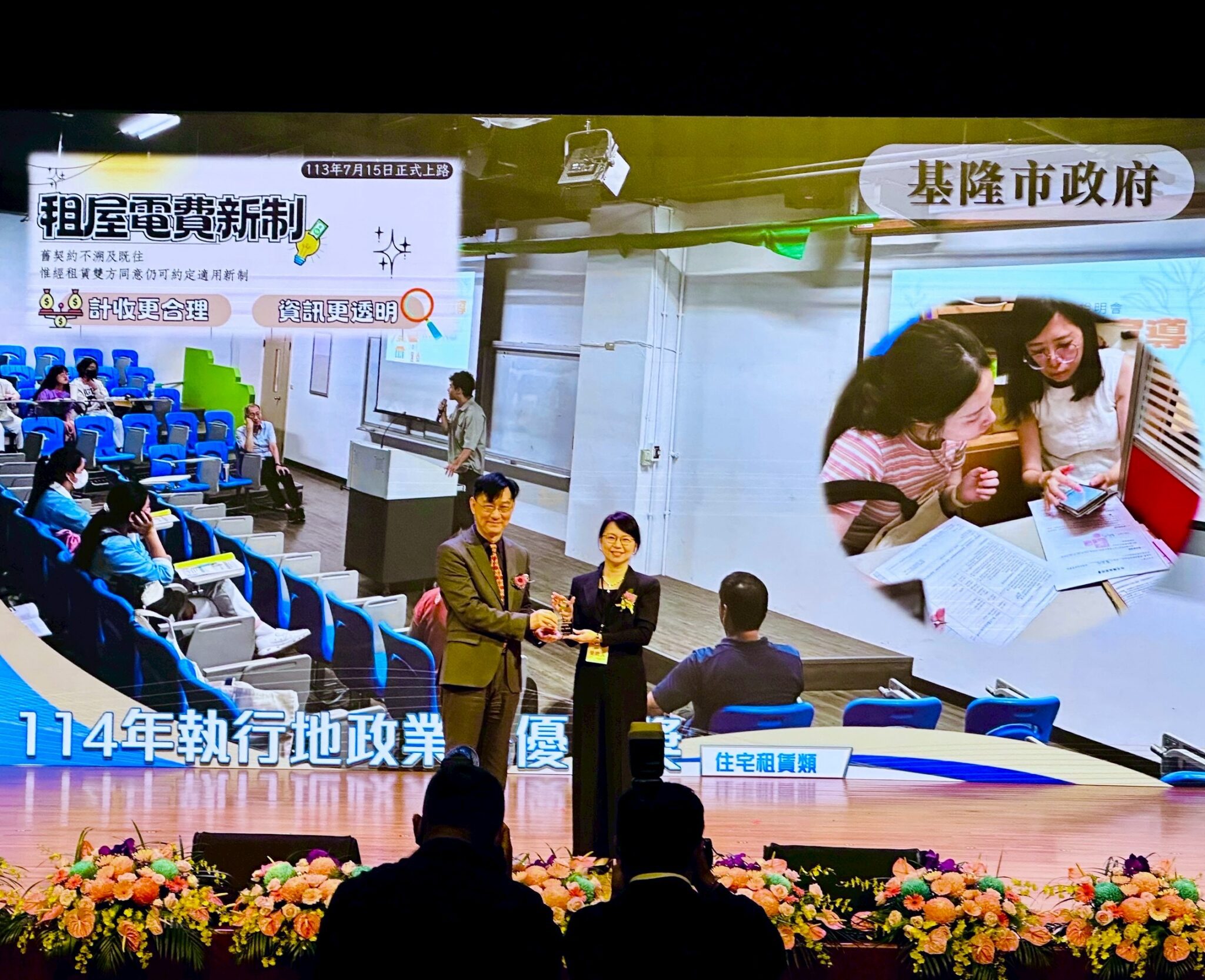 在今(11)日的地政節慶祝大會上,基隆市政府傳來捷報,地政處榮獲114年全國地政業務考評「住宅租賃類優良獎」,內政部次長董建宏頒發獎項,由地政處副處長張欣怡代表受獎,以肯定基隆市地政團隊在住宅租賃創新服務上的用心與努力。