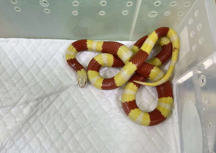 收到通報捕捉的白化納爾遜奶蛇。(新北市動保處提供)