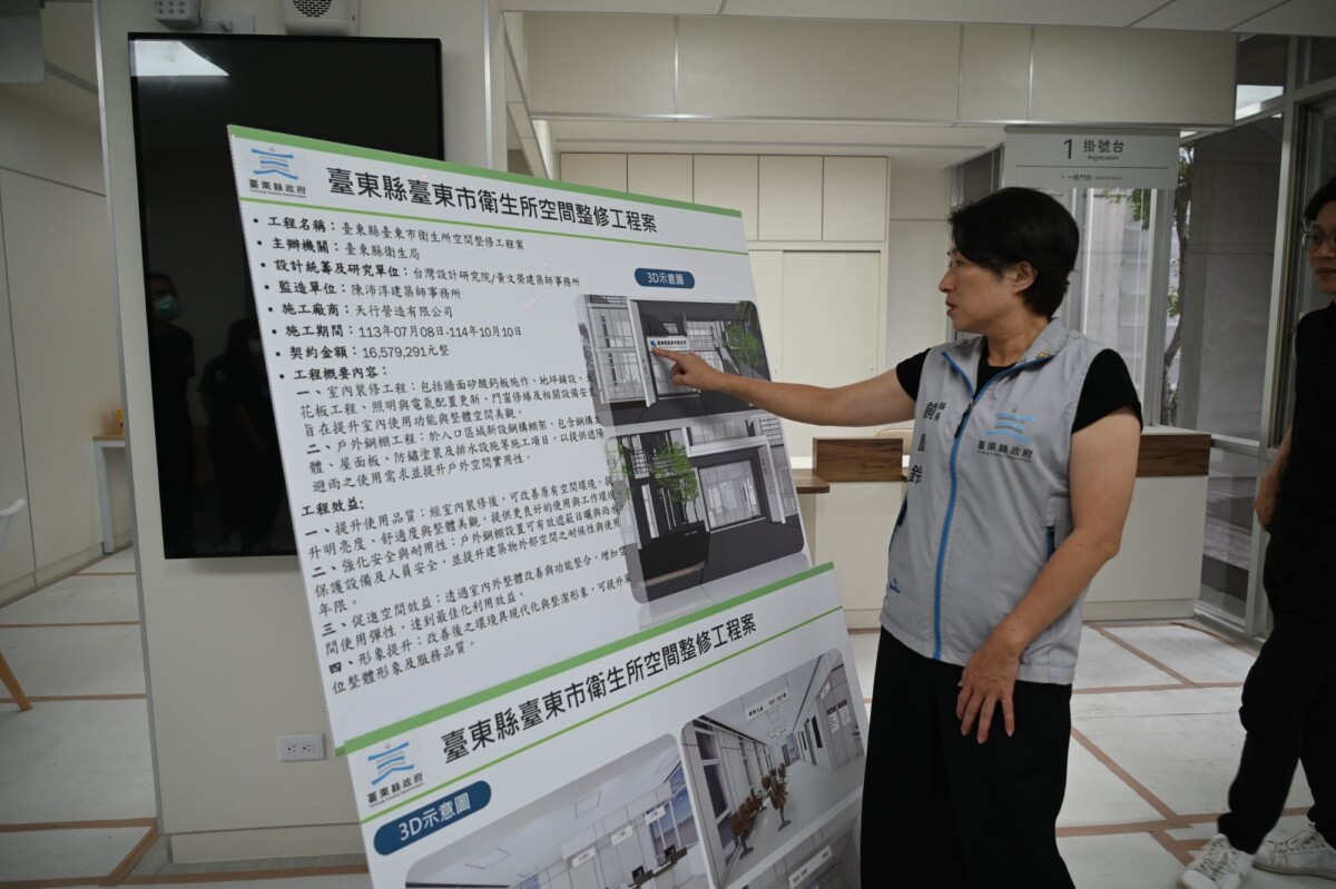 饒慶鈴表示,臺東縣政府以「人本關懷」與「設計導入」推動公共建設,臺東市衛生所服務全縣近半數人口,門診量大,服務動線及空間現況已不符合功能要求;臺東市衛生所空間整修工程,不僅是硬體翻新,更全面優化空間配置,使衛生所能提供更優質、專業且安心的公共衛生醫療服務場域,也為醫護人員創造更舒適、流暢的工作環境。