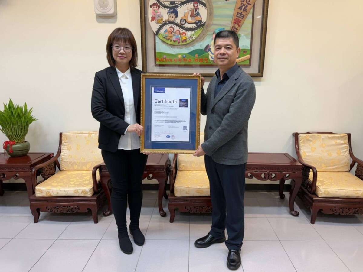 嘉義市政府警察局為提供安全可靠的警政資訊服務、強化機關資通訊安全,積極推動資訊安全管理制度(ISMS),並於今年通過ISO/IEC 27001:2022國際資安認證。日前由台灣德國北德技術監護顧問股份有限公司(TUV NORD)總經理特助鍾睿珍女士蒞臨市警局頒發證書,由局長陳明志代表受證。