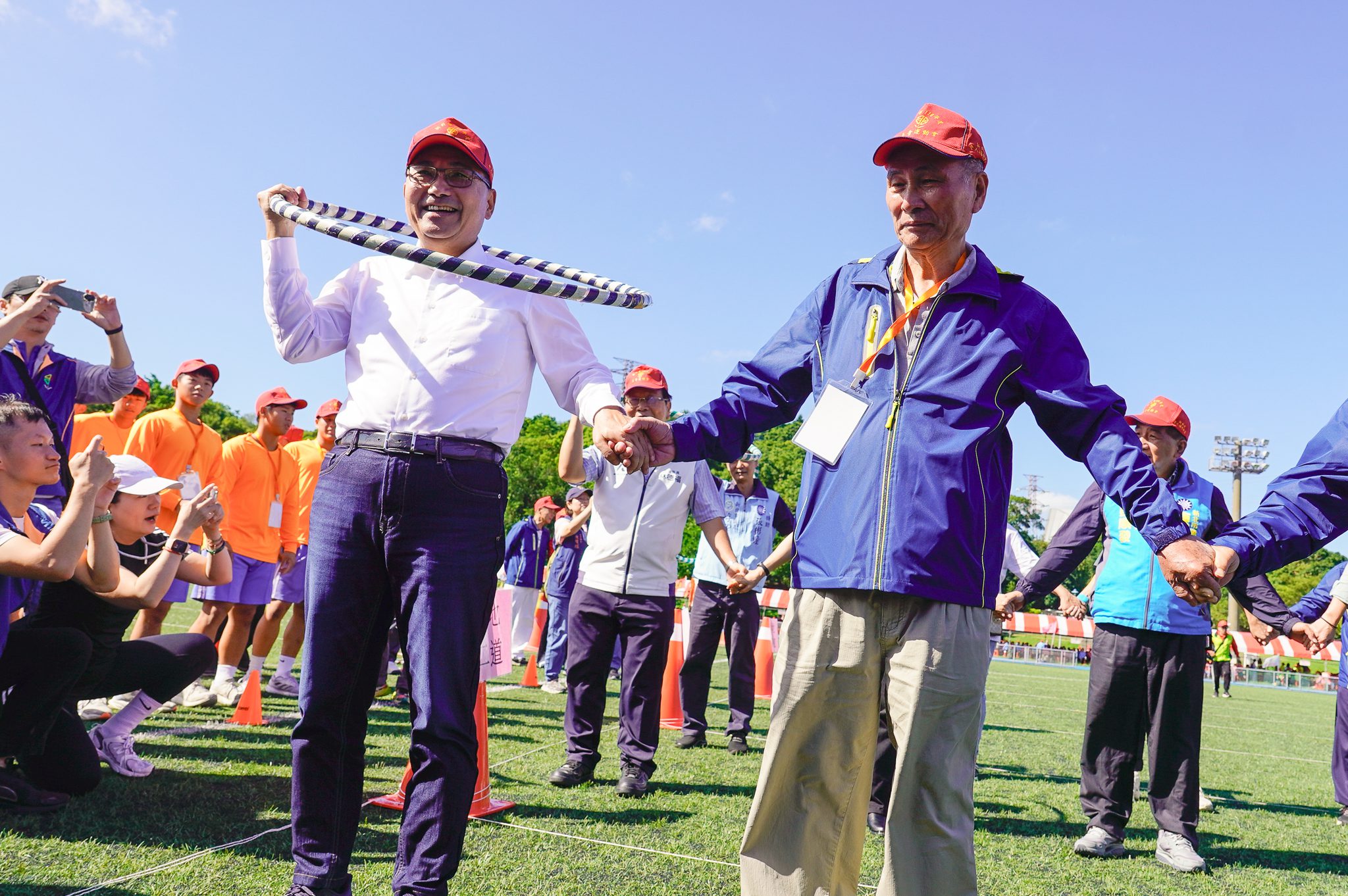 今日活動由各區代表隊繞場開始,並由專業教練帶領千名長者開懷大笑、舒活筋骨,侯友宜也與新北市老人福利聯盟理事長陳金鐘,共同以「牽手同心」揭開序幕,展開一系列趣味競賽、四肢動健康課程、運動體驗賽等活動,展現長者們的健康與活力。