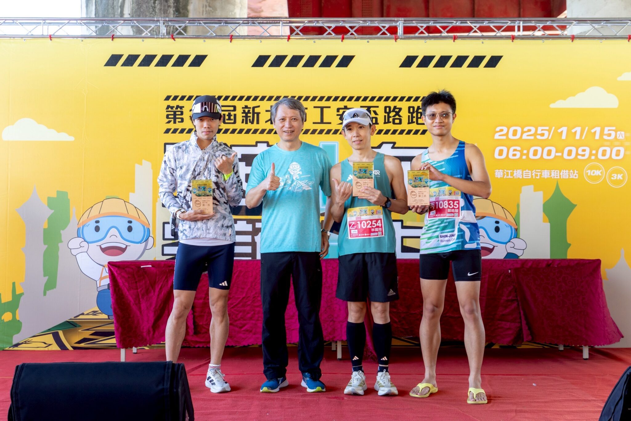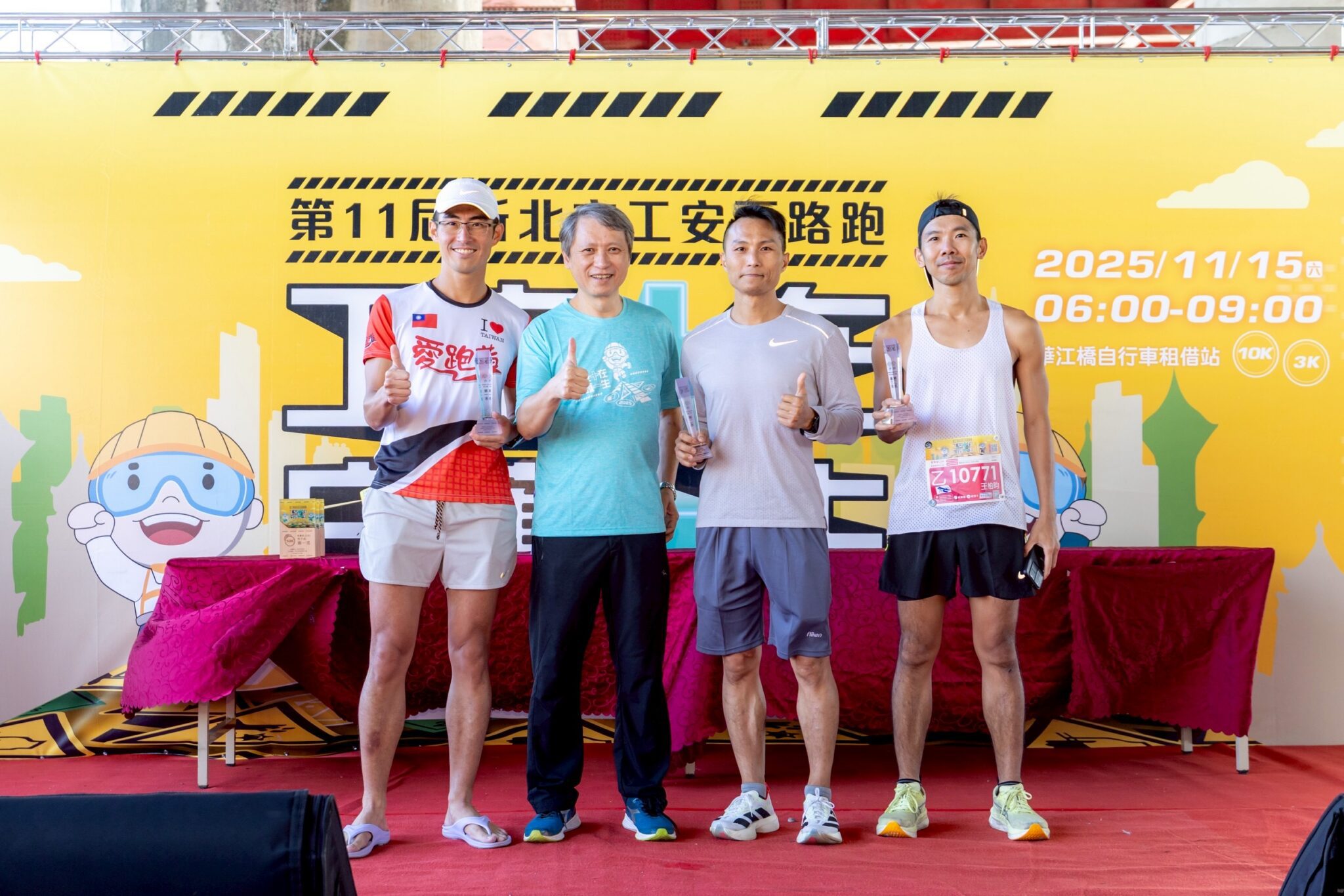 10K男總前三名,第一名是日本來台從事補教工作的吉田智裕(左一)。(新北勞工局提供)