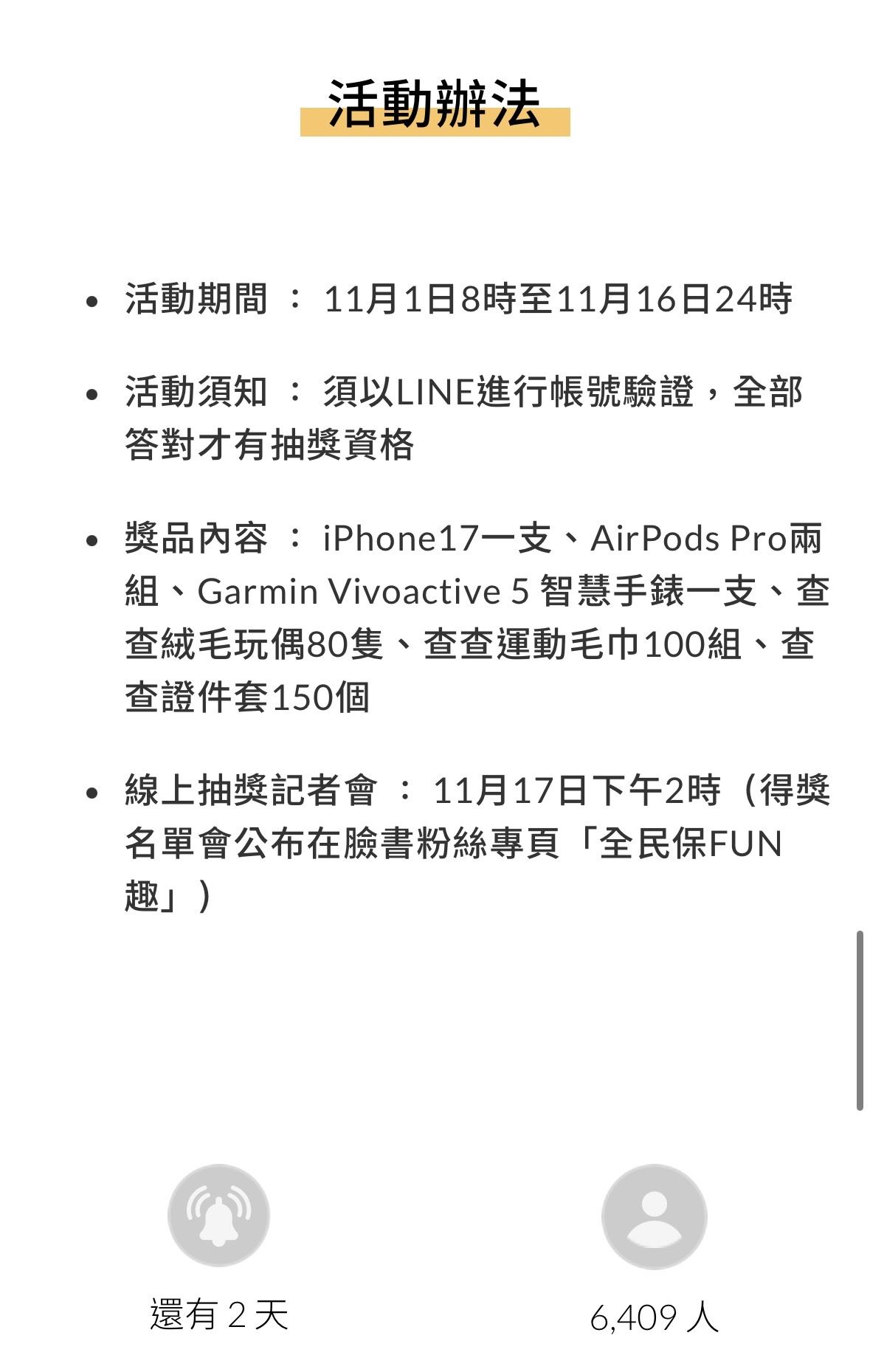 活動結合線上題庫與有獎抽獎機制,只要完成LINE帳號驗證並答對全部題目即可參加抽獎,有機會獲得iPhone 17、AirPods Pro 及 Garmin 智慧手錶等獎項,期盼藉由輕鬆互動方式提升全民防衛意識。