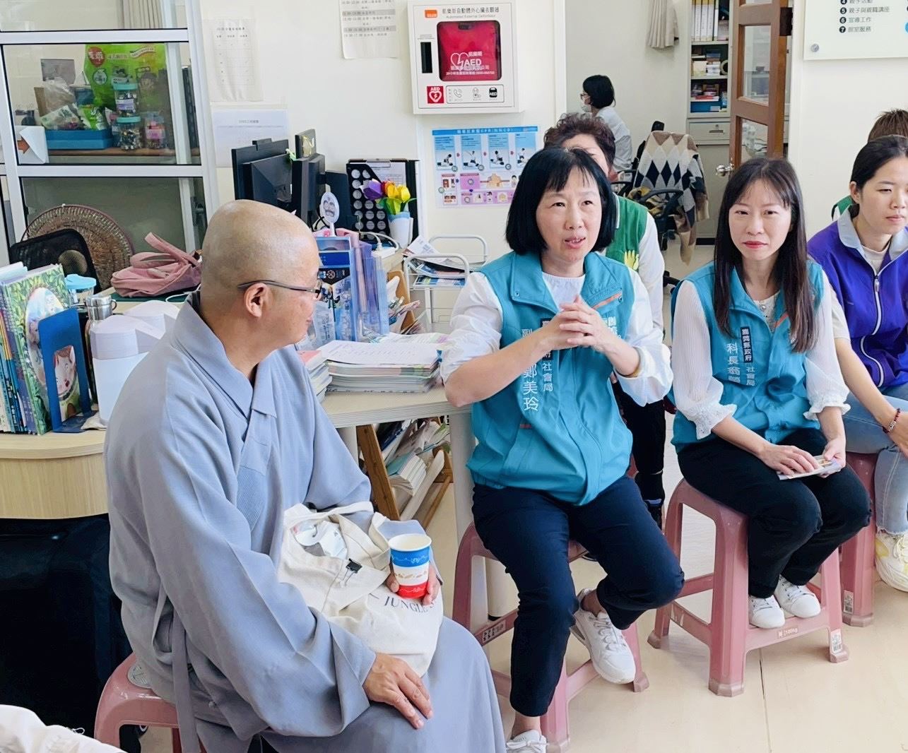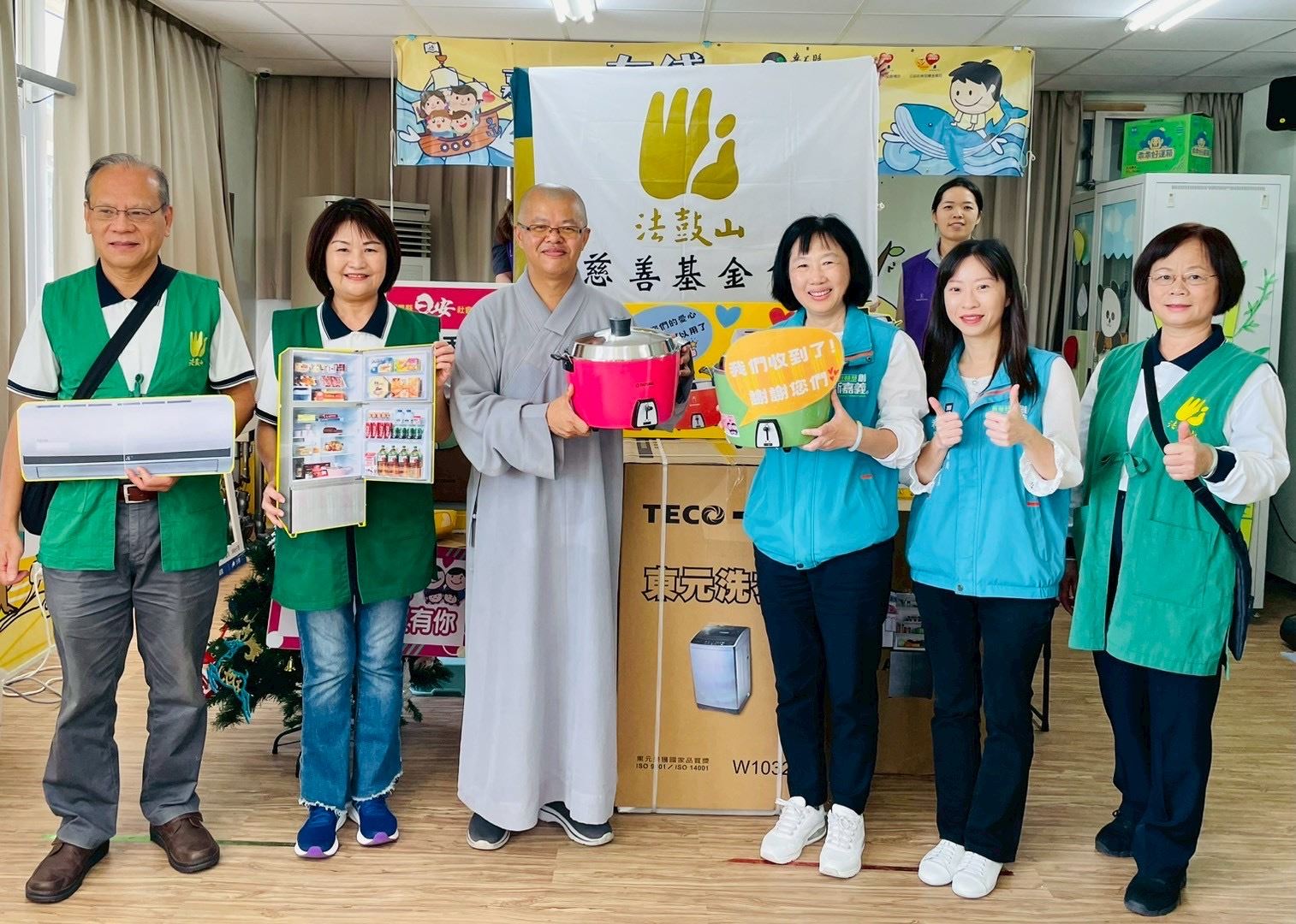 法鼓山慈善基金會秘書長常惺法師、王軍智師兄、黃秀珠師姐及嘉義區義工,與華春營造有限公司蘇進德副總、羅春祥協理、蘇彙晴及翁先生今一同來到嘉義縣布袋社福中心,眾人攜手將一件件家電送到位,化作一份份安定與希望,送進每一戶受災弱勢家庭中。