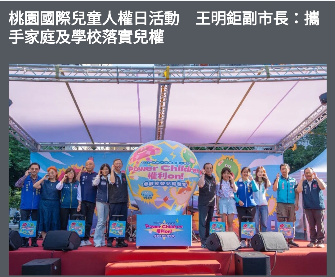 桃園市副市長王明鉅今(16)日下午前往桃園區,出席「114年度國際兒童人權日活動」。王副市長表示,每年11月20日為國際兒童人權日,核心精神在於提醒社會重視兒童與少年應被尊重、能表達意見、其聲音能被聽見並採納的基本權利;兒權落實不僅是政府責任,更須從家庭與學校向下扎根。