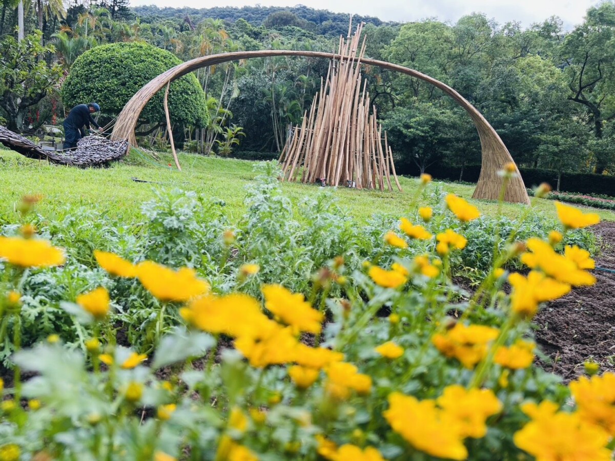 在中式庭園「幸福.憩家園」展區與藝術家小亨利共同創作竹構裝置「流光之巢」,竹材交織成溫暖穹頂,陽光從縫隙灑落,如鳥巢般象徵「夢想的起點」,周邊藤球、斗笠與菊科草花營造恬靜氛圍,讓人沉浸在緩慢舒心的鄉野氣息。