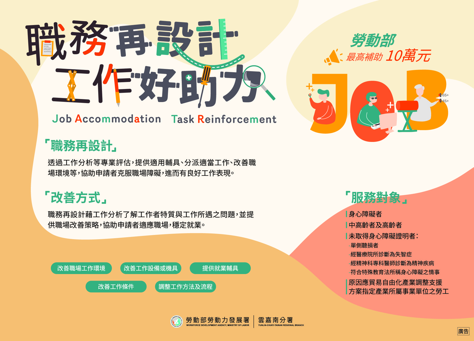 雲嘉南分署長劉邦棟表示,若中高齡員工有職場適應或工作負荷問題,雇主可運用「職務再設計」補助,透過專業評估協助企業改善設備或機具、增設輔具、優化環境或調整作業方式,協助勞工克服工作障礙、提升效能,同時兼顧生產效率與職場安全。相關改善費用最高每人每年可申請補助新臺幣10萬元,協助企業打造友善職場,讓中高齡及身心障礙勞工穩定就業、持續發揮專業,成為企業穩定新力量。