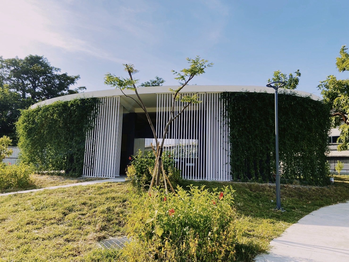 以獨特橢圓造型融入周邊景觀美學,外牆以垂直鋼索攀附蝶豆花,營造自然綠意