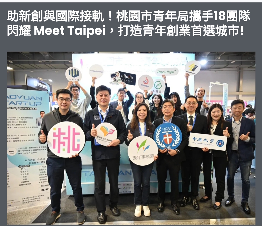 桃園市政府青年事務局侯佳齡局長表示,青年是桃園未來競爭力的關鍵,Meet Taipei 是新創團隊展現硬實力、爭取市場鏈結與合作機會的重要舞台。青年局將持續強化一站式創業支持體系,從資金、場域、技術到市場提供最完整的創業後盾,協助團隊向國際接軌,推動桃園成為最具前瞻性的青年創業首選城市。