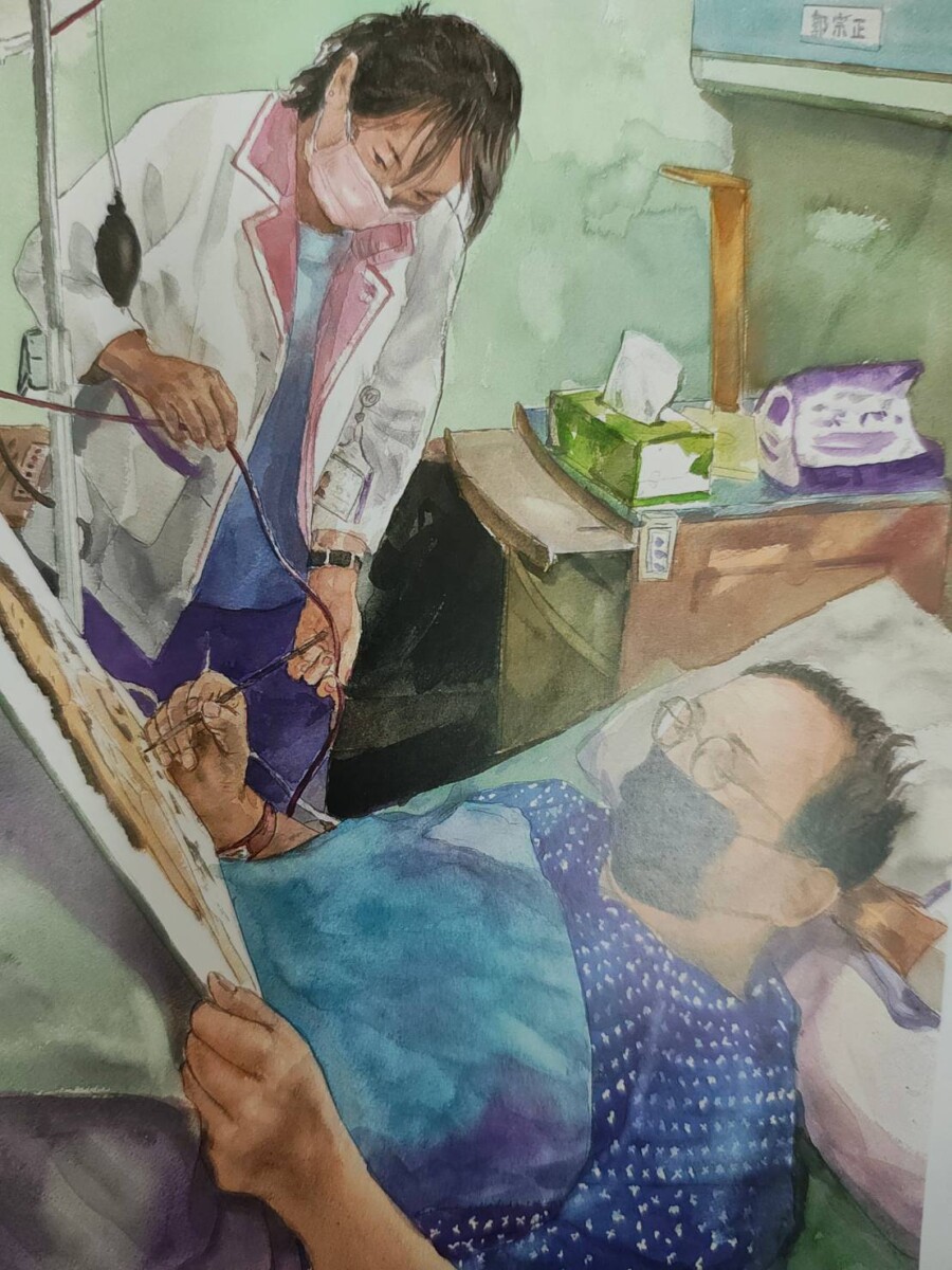 想當初臥病在床,他仍孜孜不倦提筆作畫,記錄一段病房中的時光歷程,他在病床上專注的作畫中,護理師細心地處理液体輸管,各司其職,在各自專注著不一樣的事件之間,呈現ー個寧靜祥和的時光。細微動作間穩含著尊重與關心、專注與信任。