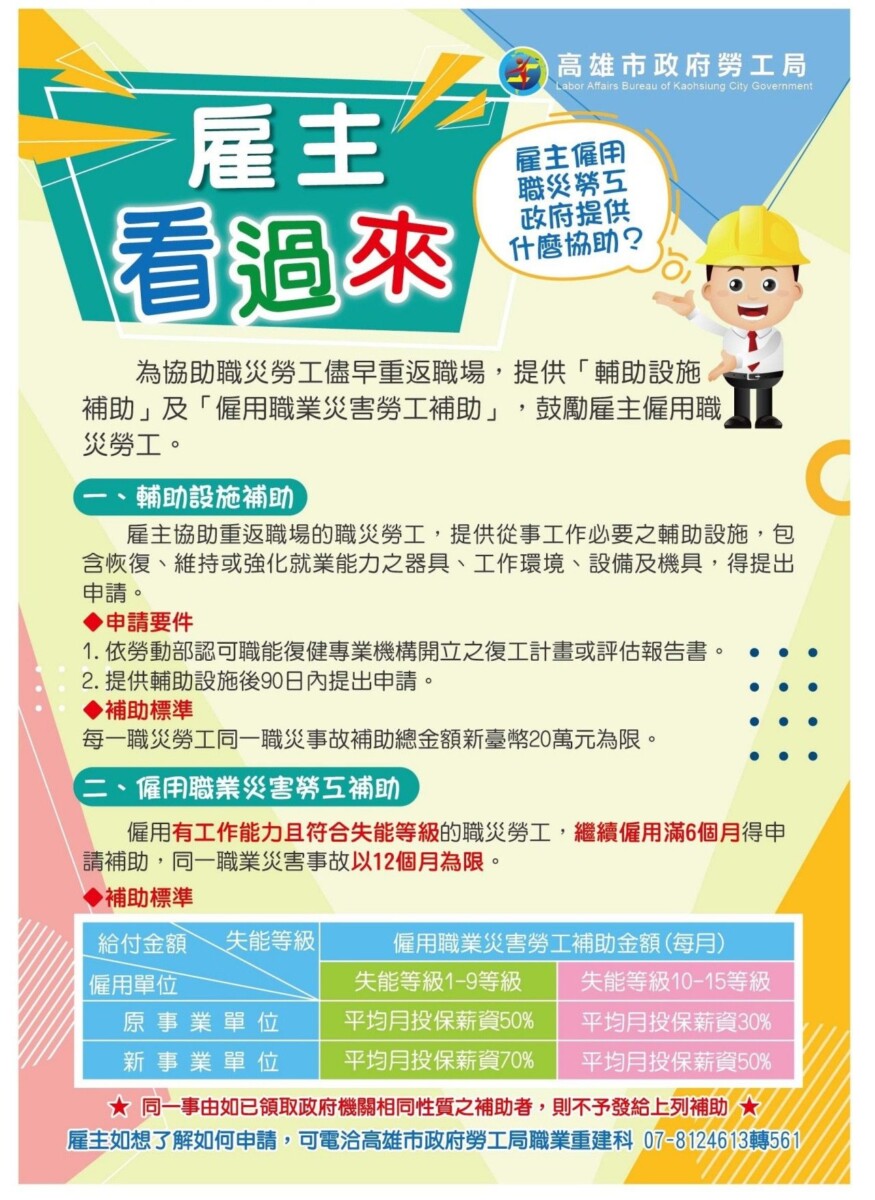 此篇文章最開始出處為: 助職災勞工重返職場 勞工局鼓勵善用三助力