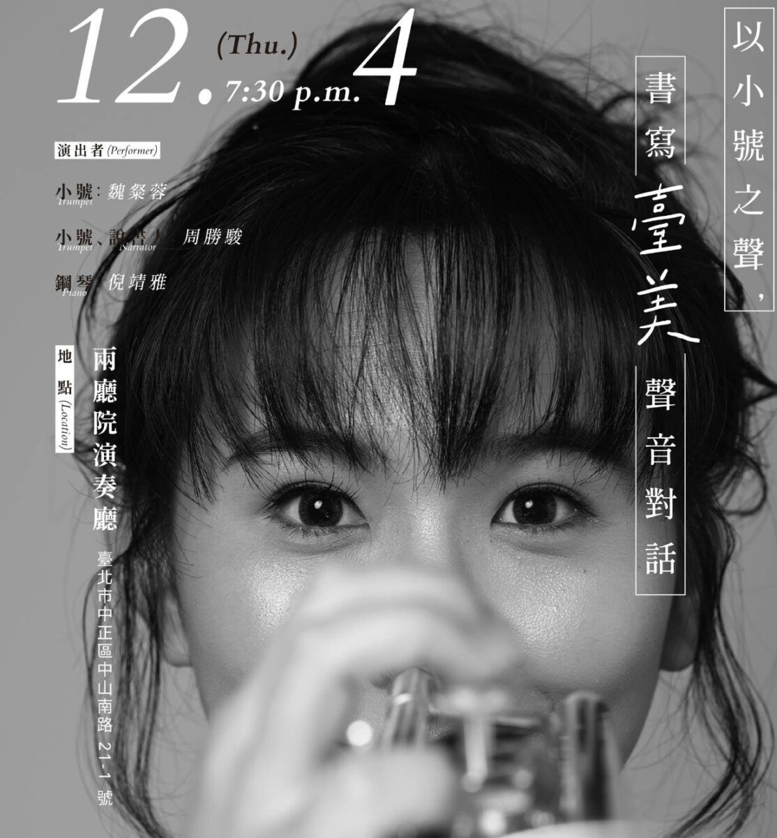 節目亦包含少見的雙小號協奏曲、融合劇場說書的三重奏等多元作品,展現小號在敘事性、空間感與音色探索上的全新可能。鋼琴合作由深耕台南的倪靖雅擔任;特邀前國立臺灣交響樂團小號首席、現任長榮航空機長周勝駿共同演出,使整場節目張力更為完整、精緻。
