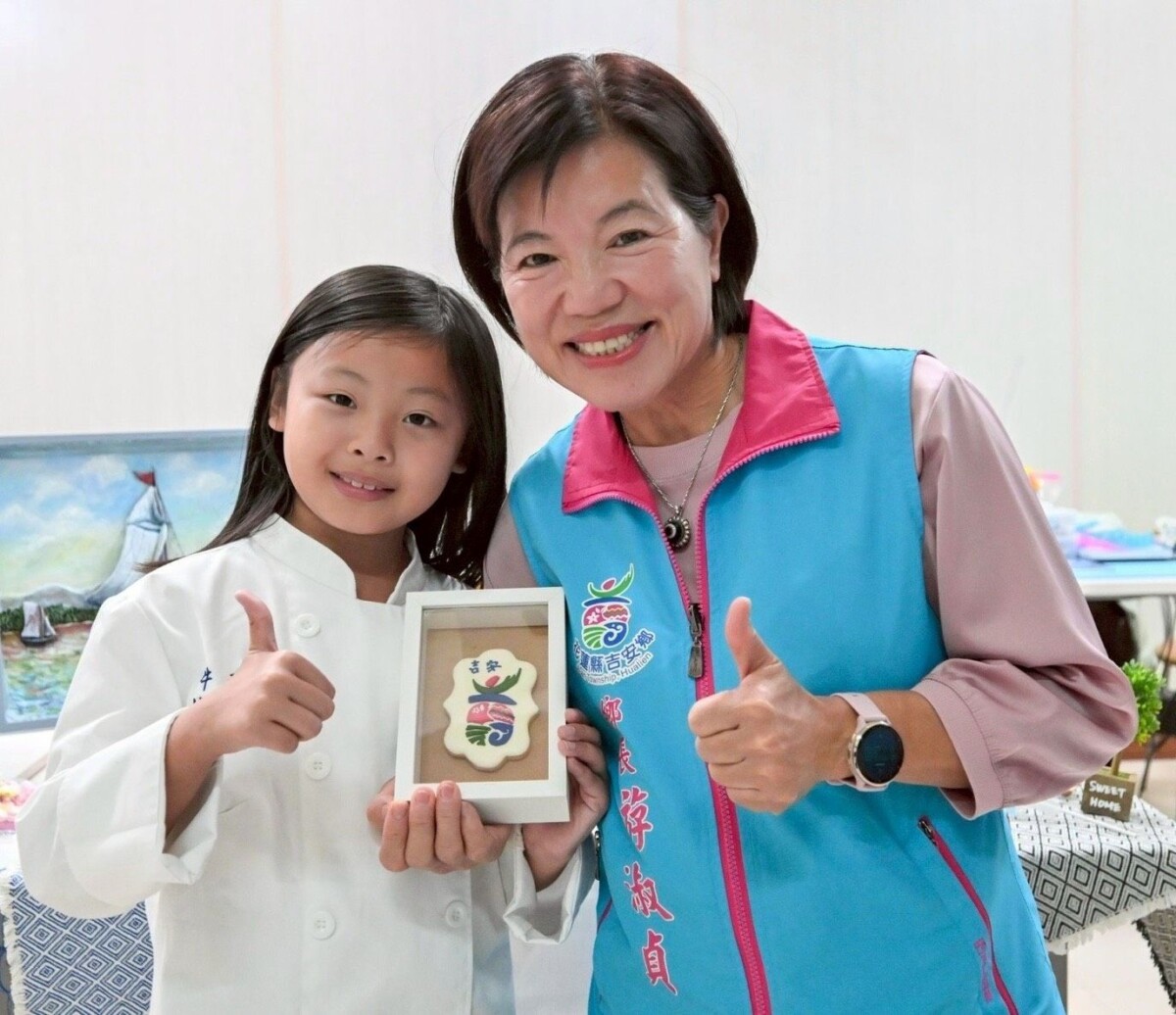 鄉長游淑貞偕同公所民政課同仁前往與黃湘涵老師烘培工作室,將紅榜贈與選手們,過程中黃湘涵老師一一細心介紹得獎作品背後的創意與心血,牛采緹同學則將親手製作的「吉安鄉徽」翻糖作品送給鄉長阿姨,隨後游鄉長也彎下腰和她一同體驗製作翻糖蛋糕的樂趣。