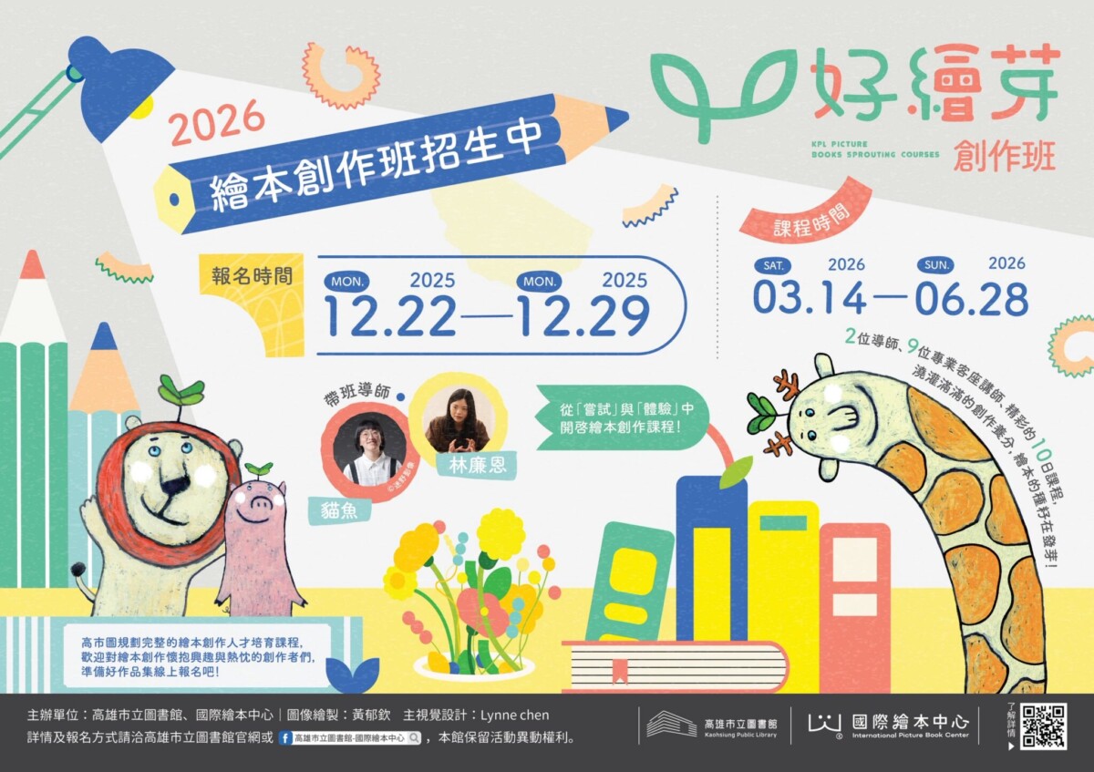 高雄市立圖書館辦理「《好繪芽》繪本創作人才扶植計畫」,自2019年起持續推動臺灣圖文創作的蓬勃能量。其中每年辦理的創作班,至今已陪伴近180位創作者完成作品雛形、踏上創作道路,更有學員成功出版,累積亮眼成果。明年度的「2026《好繪芽》繪本創作班」將於12月22日至12月29日開放線上報名,誠摯邀請熱愛故事、擁抱創意、渴望拓展創作生涯的朋友一同加入。