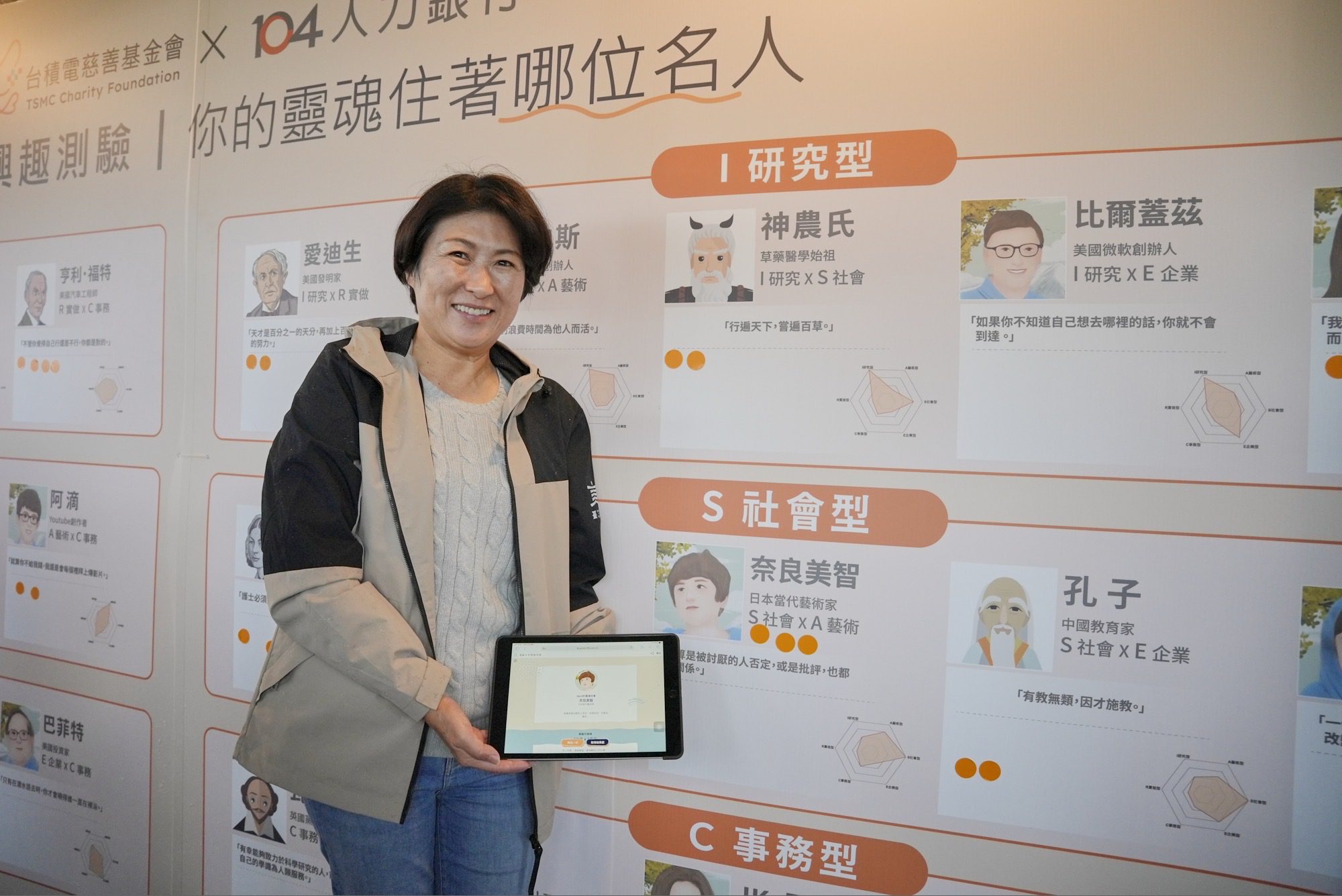 圖:台東縣饒慶鈴縣長鼓勵台東的孩子透過簡易有趣的「生涯興趣測驗」找出個人何倫碼、配對性格相近的名人,透過專家諮詢達到適性揚才。(台積電慈善基金會 提供)