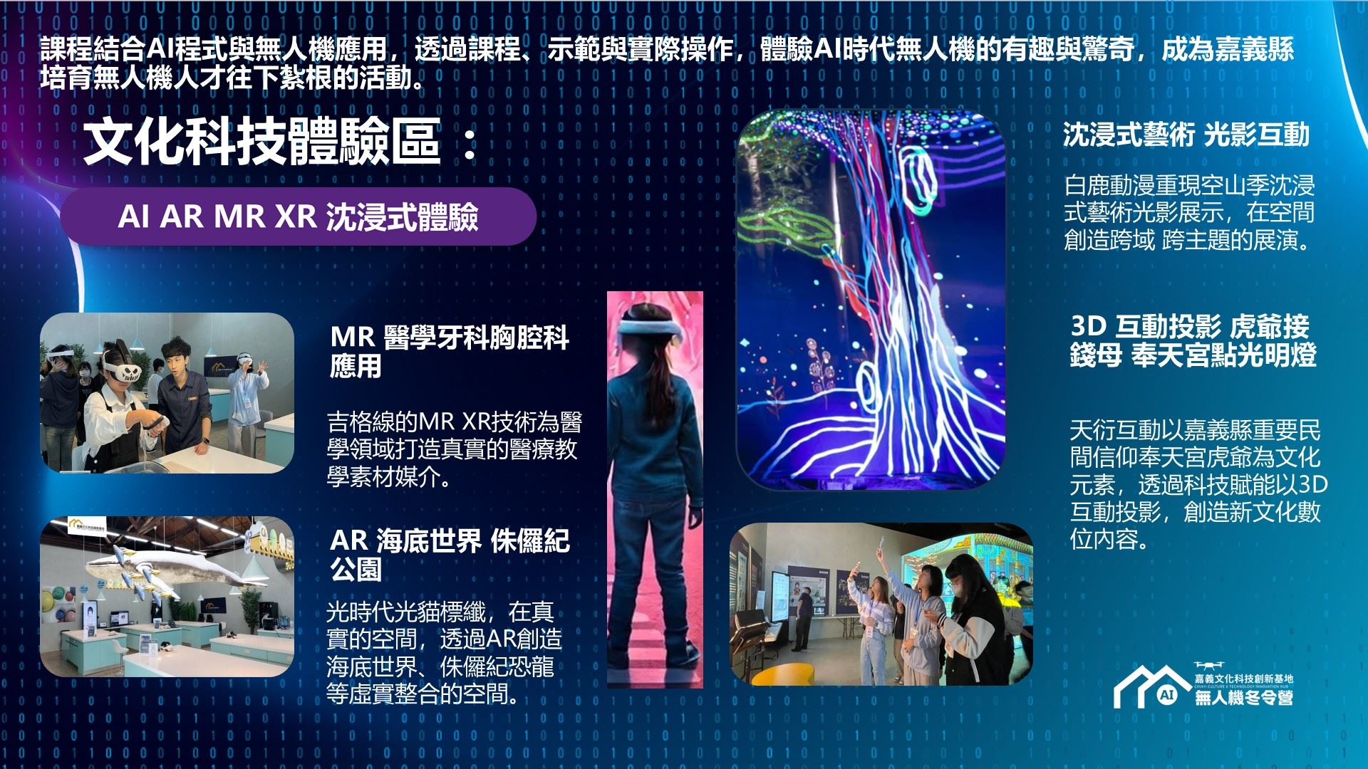 為拓展學生的跨域視野,冬令營亦規劃文化科技體驗內容,包含 MR 醫療應用、AR 沉浸式互動、3D 虛實整合展示「虎爺接錢母」與沉浸式光影藝術等,讓學生理解科技不僅是工程技術,更是文化創新與產業應用的重要力量。