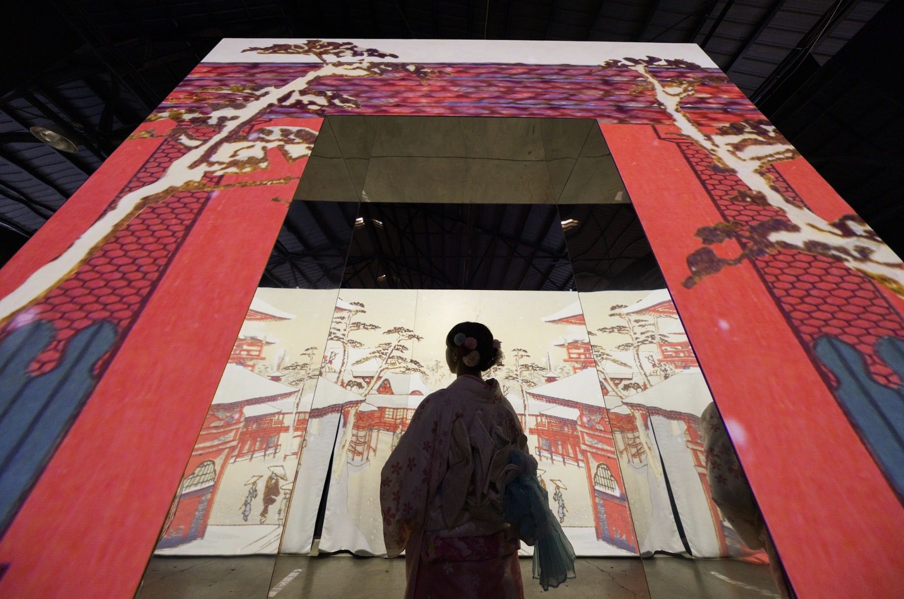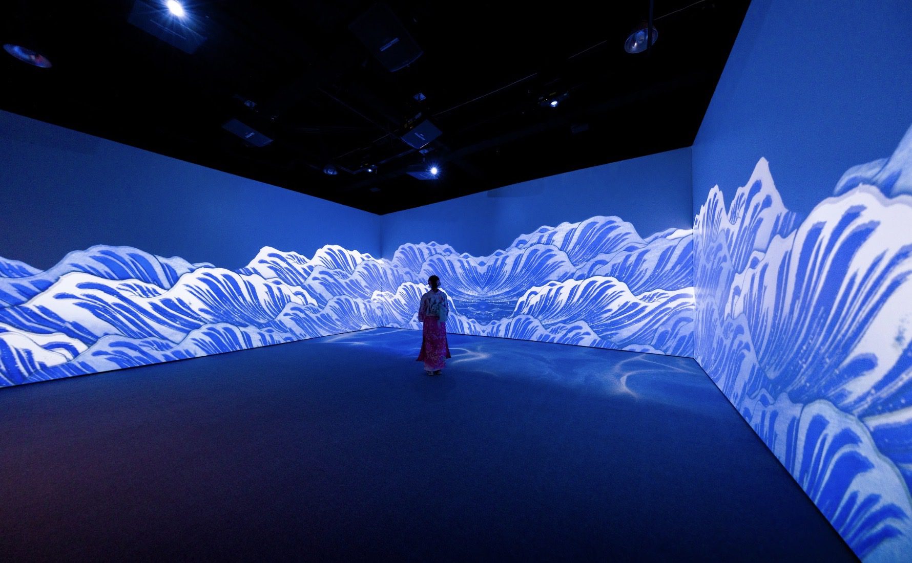 以數位影像轉譯經典名作,讓浮世繪從平面版畫延伸為流動場景,觀眾不再只是站在畫前觀看,而是被畫面包圍、彷彿親身走入江戶時代。