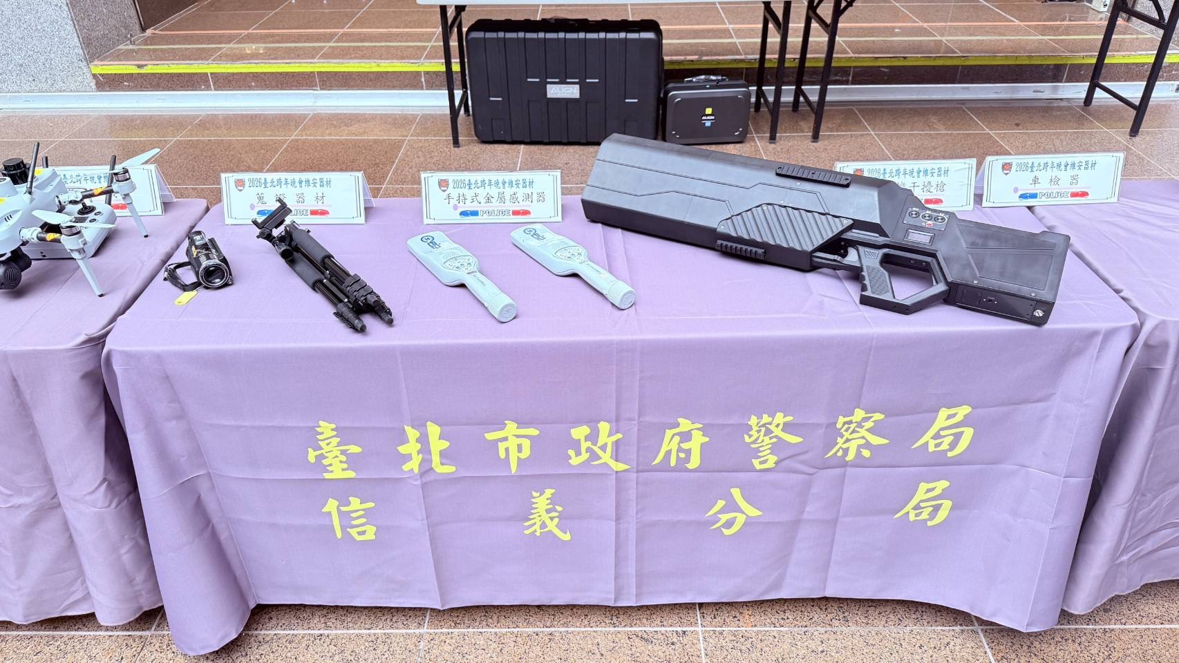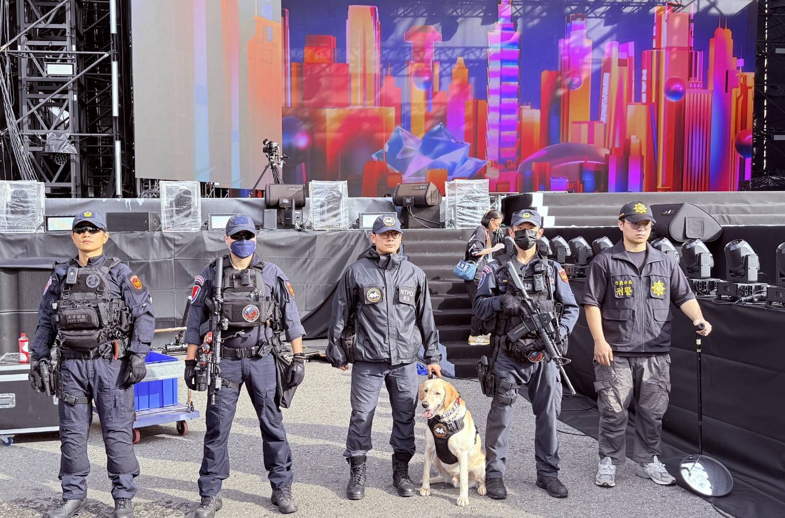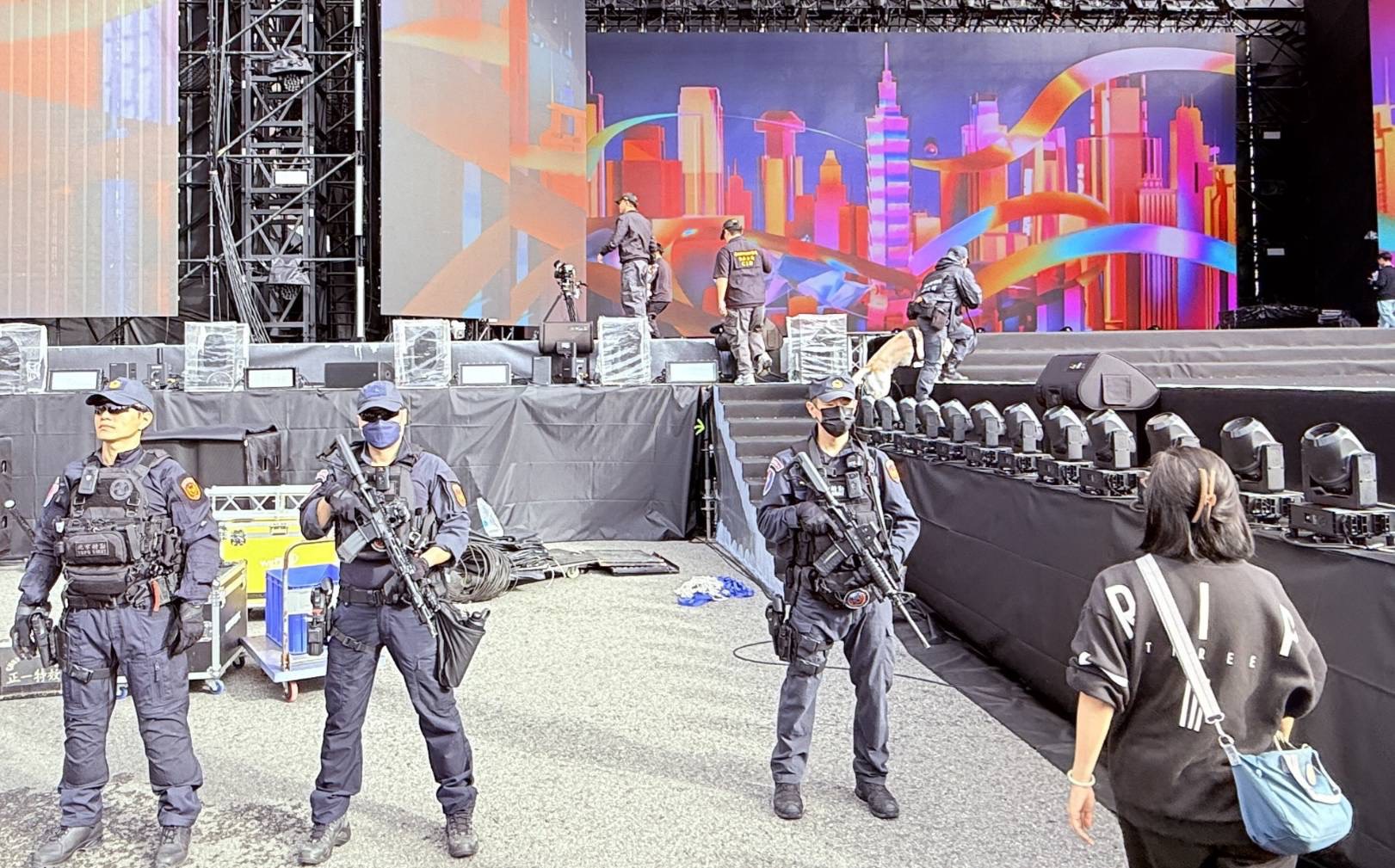 本次勤務編組27組機動打擊小組,配備必要警用裝備,包括槍彈、電擊槍、臂盾、鋼叉等,以隨時因應突發狀況;另調派指揮車、照明車等專業車輛,強化現場指揮與夜間照明效能。針對活動區域、核心舞臺及鄰近大巨蛋、國父紀念館等周邊地區,警方將進行全面清查,強化對可疑人、事、物之安全查察。對於未經核准飛行之無人機,將採取干擾及迫降措施,建構完整空域安全防護網,確保維安無死角。