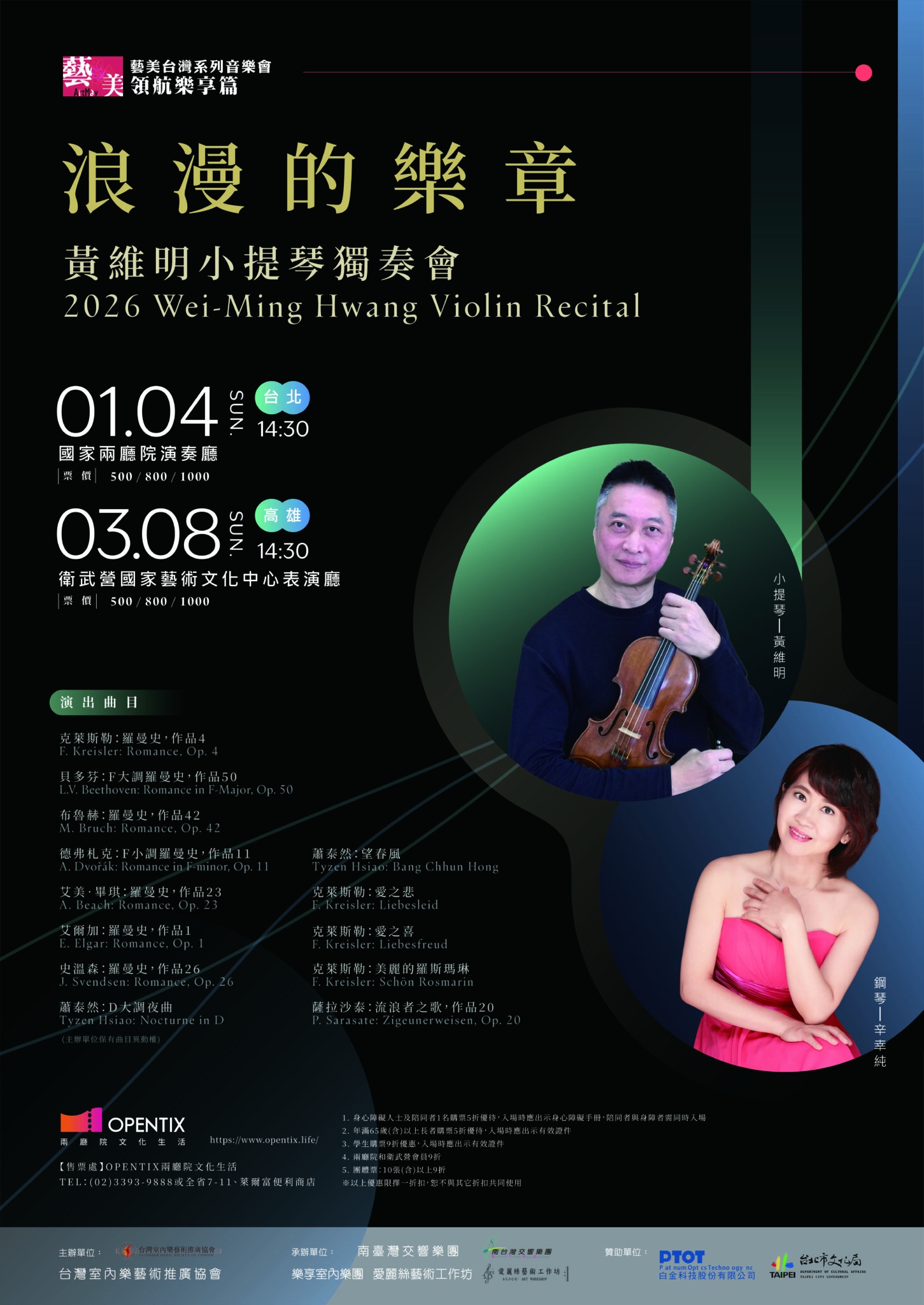 由台灣室內樂藝術推廣協會主辦,《2026黃維明小提琴獨奏會──浪漫的樂章》於1月4日下午在國家兩廳院演奏廳隆重登場。演出當日座無虛席,現場掌聲與安可聲此起彼落,為2026年揭開一場兼具藝術高度與情感深度的新年音樂盛會。