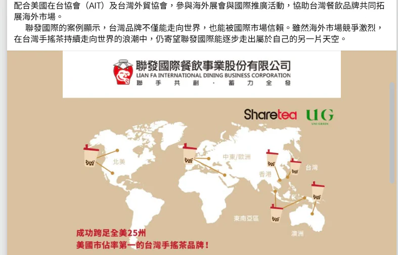黃世聰說,聯發國際近年推出新時尚茶飲品牌UG(UG Tea),以潮流設計與年輕化定位切入新世代市場,去年正式進軍美國市場,延續集團以台灣為核心、循序推進海外的發展策略,成長動能都是與營運模式都是由台灣總部主導。聯發國際還多次配合美國在台協會(AIT)及台灣外貿協會,參與海外展會與國際推廣活動,協助台灣餐飲品牌共同拓展海外市場。
