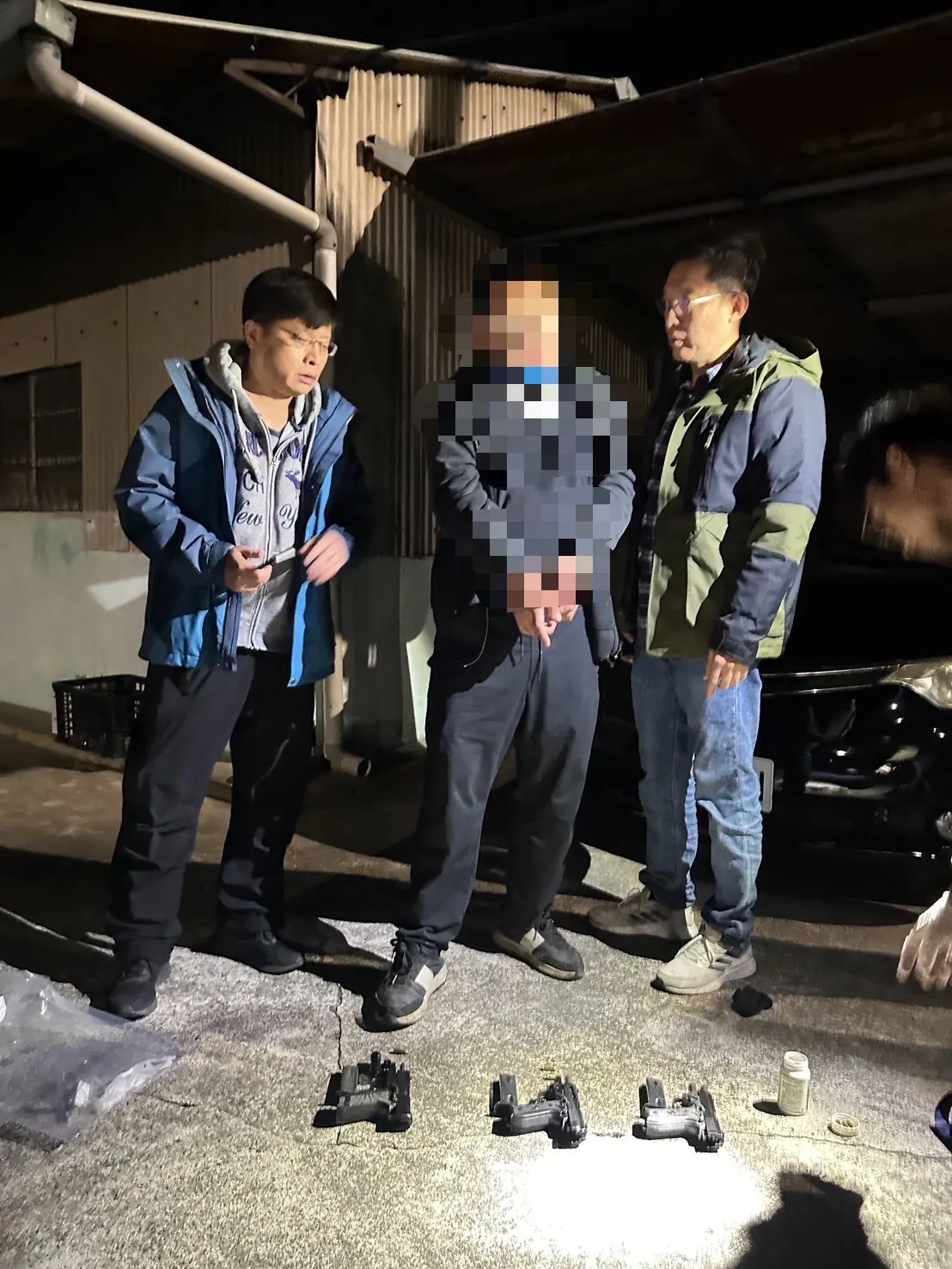 本分局立即組成專案小組,經蒐證及調閱監視器掌握犯嫌行跡動向後,循線3小時即在中埔鄉中埔村一帶,查獲蔡姓犯嫌到案,並於蔡嫌自小客車內查扣改造手槍3枝、子彈6顆及第二級毒品依托咪酯菸彈1顆等證物。全案依涉犯槍砲、毀損、妨害自由等罪嫌,移送臺灣嘉義地方檢察署偵辦。