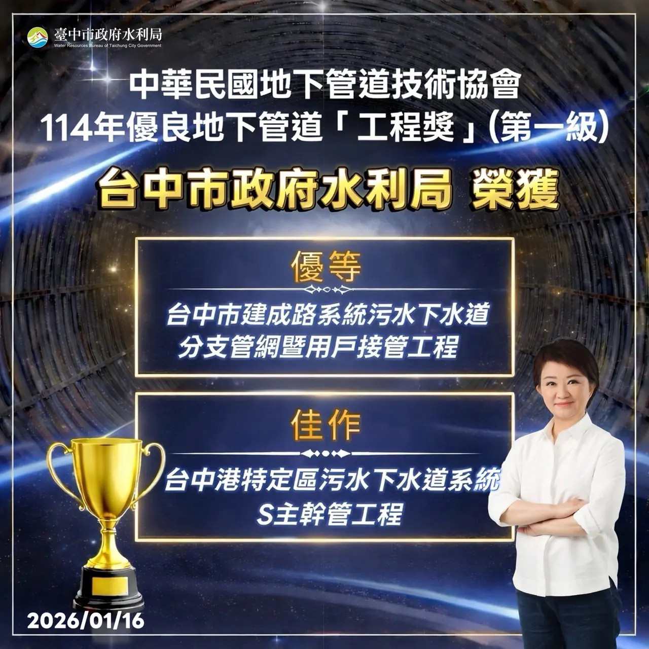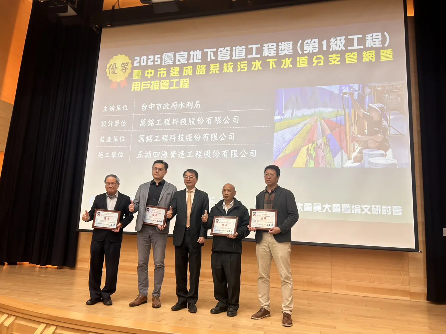中華民國地下管道技術協會主辦「114年度優良地下管道工程頒獎典禮」於今(16)日在國立台北科技大學集思會議中心盛大舉行,台中市政府水利局以「台中市建成路系統污水下水道分支管網暨用戶接管工程」及「台中港特定區污水下水道系統-S主幹管工程(一)」兩案,分別榮獲工程獎(第一級)優等及佳作殊榮,展現市府在污水下水道工程建設及推動用戶接管上的卓越成果,深獲業界肯定。