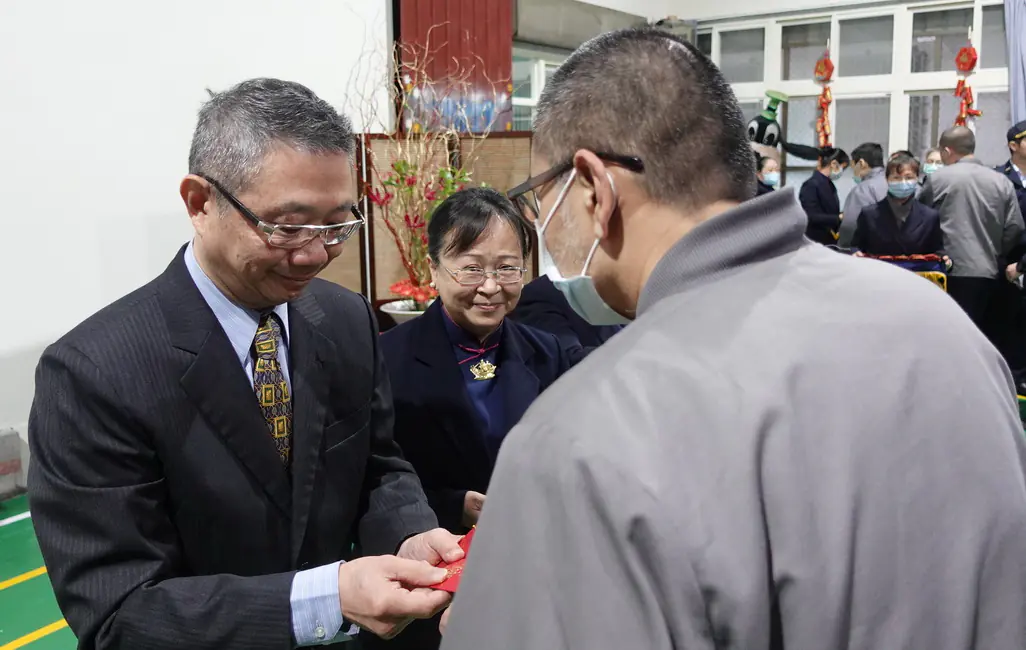 活動在莊嚴肅穆的祈福儀式中拉開序幕,當「南無本師釋迦牟尼佛」的佛號聲緩緩響起,現場收容人紛紛閉目合十,在寧靜的氛圍中虔誠祈願。隨後,典獄長黃正勇親手將一份份象徵「福德與智慧雙修」的福慧紅包送到每一位收容人手中。這些紅包承載著證嚴上人的深切祝福,不僅是佳節的慰問,更是一份鼓勵大家在未來歲月裡增長智慧、廣植福德的溫柔期許。