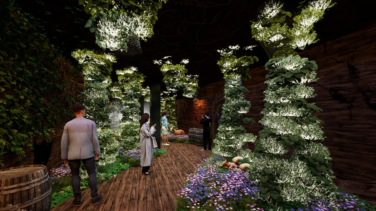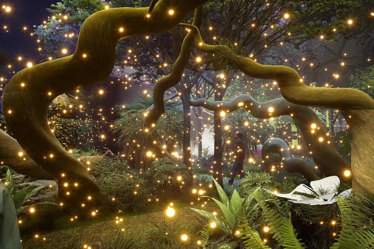旅程首先將被氣勢磅礴的「馬首引領」震撼,踏入神秘的綠光之森,燈影在林間流動,彷彿瞬間穿越至遠古雨林;耳畔傳來鳥鳴、獸吼與風聲交織,春雷乍響,大地甦醒,萬物在黑夜中悄然復活。沉浸之際,偶然發現林深之處竟藏著一艘遺世獨立的擱淺船骸—「綠舟棲地」,引人無限想像。