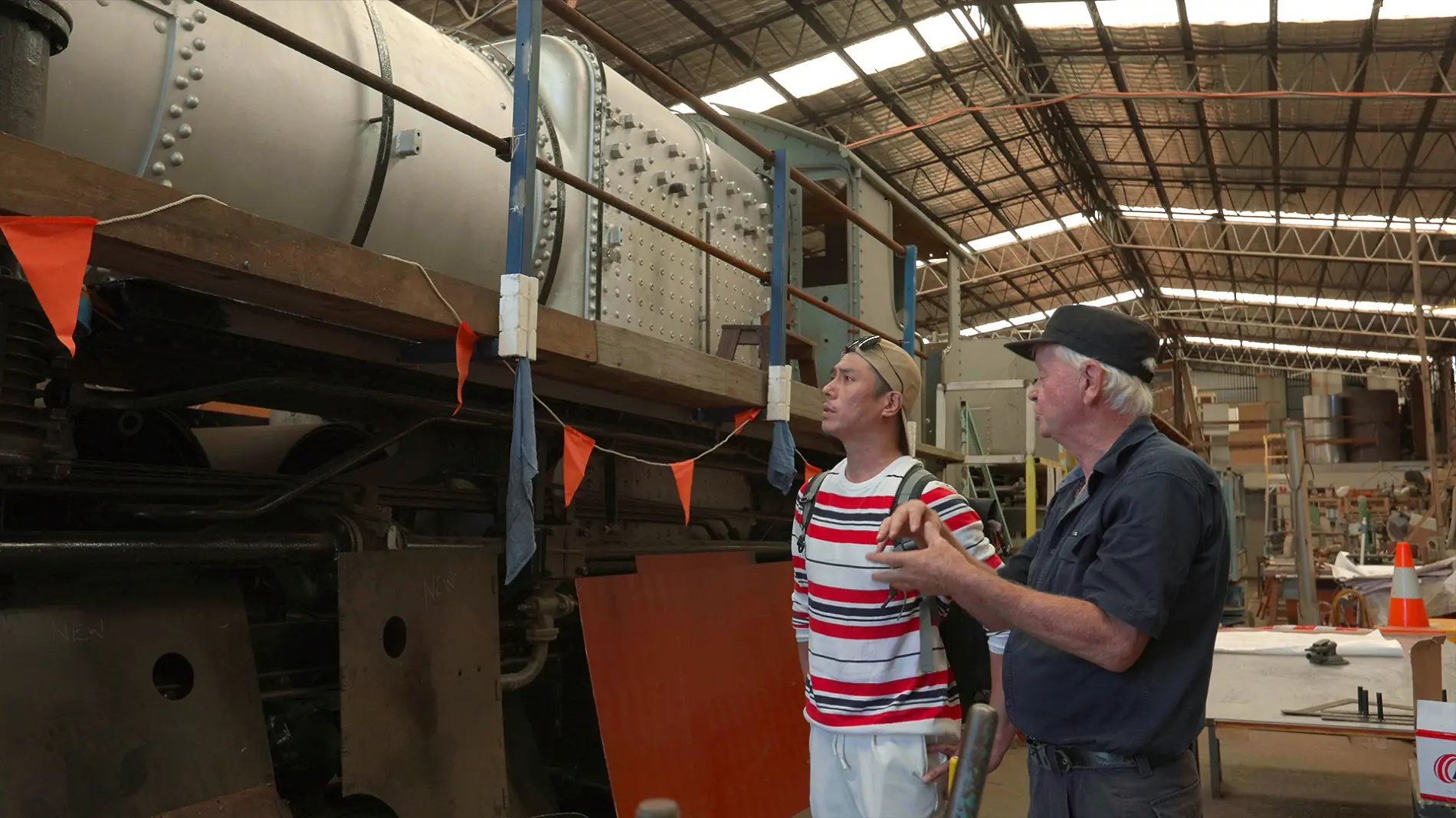 莊凱勛搭上從墨爾本一路往北300多公里的懷舊慢速列車深入澳洲內陸。當看到復古木質車廂的瞬間,他忍不住驚呼:「好漂亮啊!全都是木構的,像走進時光隧道,很有西部拓荒電影的感覺!」這些從1923年延續至今的古老車廂,瞬間勾起莊凱勛最深刻的童年記憶。