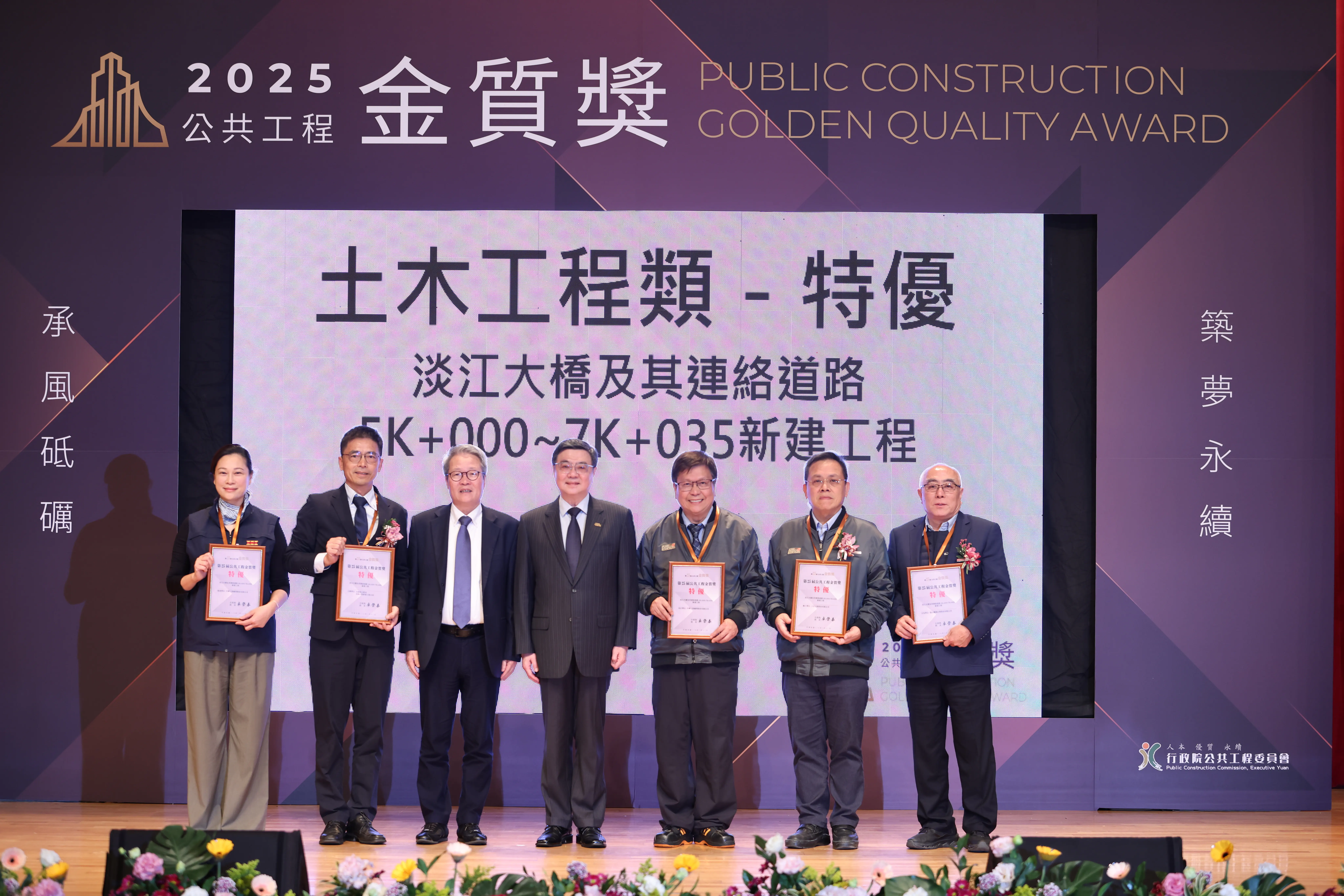 行政院公共工程委員會於(21)日舉行「第25屆公共工程金質獎」頒獎典禮,行政院院長卓榮泰親臨典禮,並頒發「公共工程品質優良獎」「公共設施維護管理獎」個人貢獻獎特優獎,向得獎團隊觀禮人員表達誠摯感謝