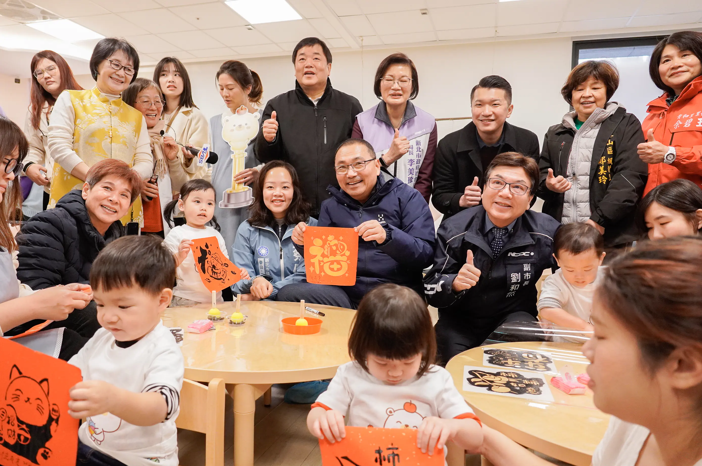 新北市長侯友宜、副市長劉和然與家長及幼兒,一起DIY章蓋印春聯。(新北市社會局提供)